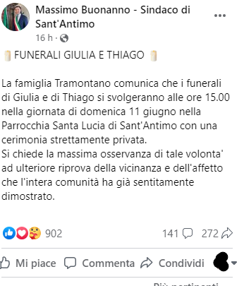 “Grazie a tutti dell’affetto che ci avete dimostrato in questi giorni atroci – ha scritto la ragazza – I vostri pensieri ci hanno inondato di amore e vicinanza. Ora però è il momento dell’ultimo saluto intimo e straziante a Giulia e Thiago e vorremmo viverlo insieme ai parenti ed amici più stretti. Siamo certi che capirete, perché in questi giorni avete dimostrato di saper vivere il nostro stesso dolore, operare il nostro stesso silenzio e commemorare Giulia con amore e rispetto”.