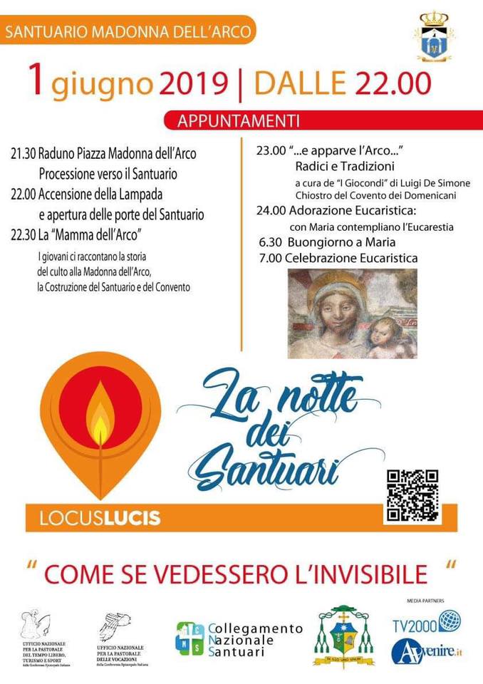 Accendere una luce sul forte valore simbolico che i Santuari hanno per la comunità cristiana e per l’umanità tutta. Questo è lo spirito di «La notte dei Santuari» proposto dal collegamento nazionale dei santuari italiani con l’ufficio nazionale per la pastorale del tempo libero, turismo e sport della CEI, in collaborazione con l’ufficio nazionale per la pastorale delle vocazioni. Sabato 1 e domenica 2 giugno, i Santuari d’Italia che vi hanno aderito saranno tutti un fermento di attività culturali e alle 22 di sabato tutti, proprio tutti, apriranno le porte e accenderanno una lampada – Locus Lucis – così da creare un’unica luce di comunione con gli altri santuari d’Italia. In Campania, oltre al Santuario di Madonna dell’Arco, questa Luce unirà San Francesco a Folloni di Montella (Avellino), Maria SS della Neve a Torre Annunziata, il Santuario di Pompei, Maria Santissima delle Tre Corone a Sarno, Maria SS Consolatrice del Carpinello a Visciano.