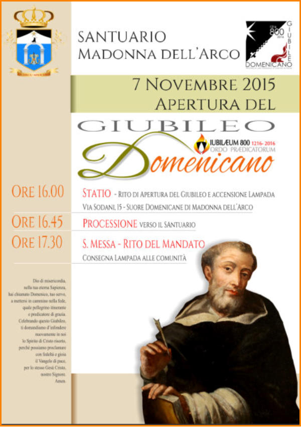 Al Santuario di Madonna dell’Arco, in contemporanea con tutti i conventi domenicani del mondo, si aprirà il Giubileo per gli ottocento anni dalla fondazione dell’Ordine. Alle 16 ci sarà il rito della «Statio», alla casa delle suore domenicane in via Sodani a Sant’Anastasia: lì sarà accesa la Lampada Giubilare. Dopo, tornati in processione al Santuario, si celebrerà la Santa Messa e la consegna della lampada alla comunità. L’anno giubilare ha per tema «Mandati a predicare il Vangelo», parole che richiamano l’incipit delle Bolle promulgate da Papa Onorio III che, nel 1216 e nel 1217, confermarono la fondazione dell’Ordine. Papa Onorio, approvando i Predicatori, li presentava come totalmente dediti alla evangelizzazione attraverso l’annuncio della Parola di Dio. La consacrazione alla Parola, per la predicazione e la contemplazione, permette unità che, nella famiglia Domenicana è essenziale, poiché legata alla missione della predicazione del Regno.