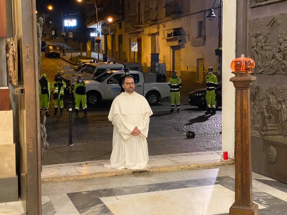 Alle tre del mattino di ieri, presidiate da un cordone imponente di forze dell’ordine, le porte del Santuario si sono spalancate, mandando in diretta streaming sui social un’immagine che rimarrà, potente, nella storia del pellegrinaggio di Madonna dell’Arco dove, da più di cinque secoli, arrivano il giorno del Lunedì in Albis in circa cinquecentomila tra fujenti, devoti, curiosi. L’immagine è quella del priore salentino del Santuario Mariano, padre Alessio Maria Romano, vestito con la tonaca bianca dei Domenicani, inginocchiato sul marmo – da solo – a rappresentare le migliaia di «battenti» che non hanno potuto, stavolta, percorrere la navata per prostrarsi dinanzi all’icona della Mamma dell’Arco.