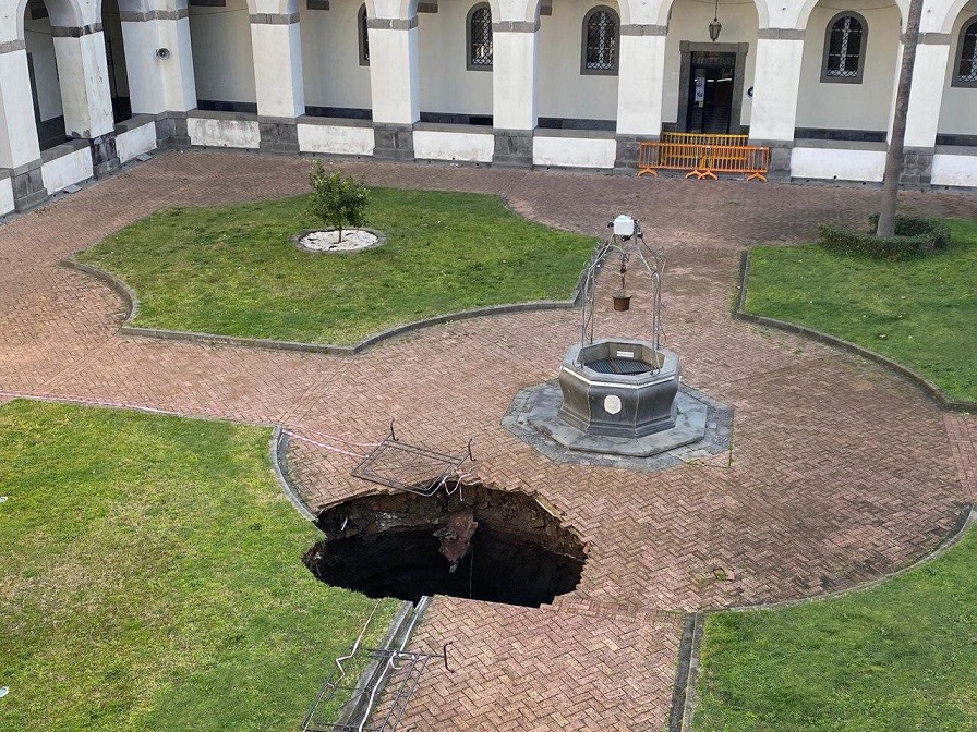 La storia del convento è lunga: ha attraversato eruzioni del Vesuvio, soppressione napoleonica, crolli e restauri. Tra varie vicissitudini, si arriva alla radicale ristrutturazione terminata nel 1999 in occasione del Giubileo del 2000, fu allora che il livello del chiostro venne rialzato di un metro, portandolo quasi a livello dei corridoi laterali. Il chiostro, con il pozzetto al centro dove i pellegrini gettano monetine, dove giocano i bambini, dove gli sposi si attardano per qualche scatto dopo la celebrazione di matrimoni, dove passeggiano gli innamorati e dove il giorno simbolo dedicato alla Mamma dell’Arco, il Lunedì in Albis, si affollano i «battenti» per riposarsi, per ritemprarsi, ora è transennato. Inagibile. Circondato da nastro giallo e delimitato da cordoni, quasi come un luogo del delitto in un film noir. Quella ferita, quella voragine, quel baratro che se non fosse in un luogo di spiritualità potrebbe far pensare ad una discesa agli inferi, è frutto di un errore. Un errore compiuto proprio durante i lavori del Giubileo quando si pensò di eliminare il dislivello tra chiostro e passeggiata laterale, eliminando i gradini e portandoli sullo stesso piano. Al centro del chiostro, dove sorge la cisterna con sopra il pozzetto, furono riversati detriti, calcinacci, materiale di risulta, terreno. Il peso ha evidentemente fiaccato il tetto della cisterna, le infiltrazioni hanno fatto il resto. Così il pavimento ha ceduto, e continuerà a farlo. Non potranno fermarvisi i fujenti nel giorno di Pasquetta, non potranno giocarvi i bambini, non vi si potranno attardare gli sposi, non vi si potranno organizzare eventi.