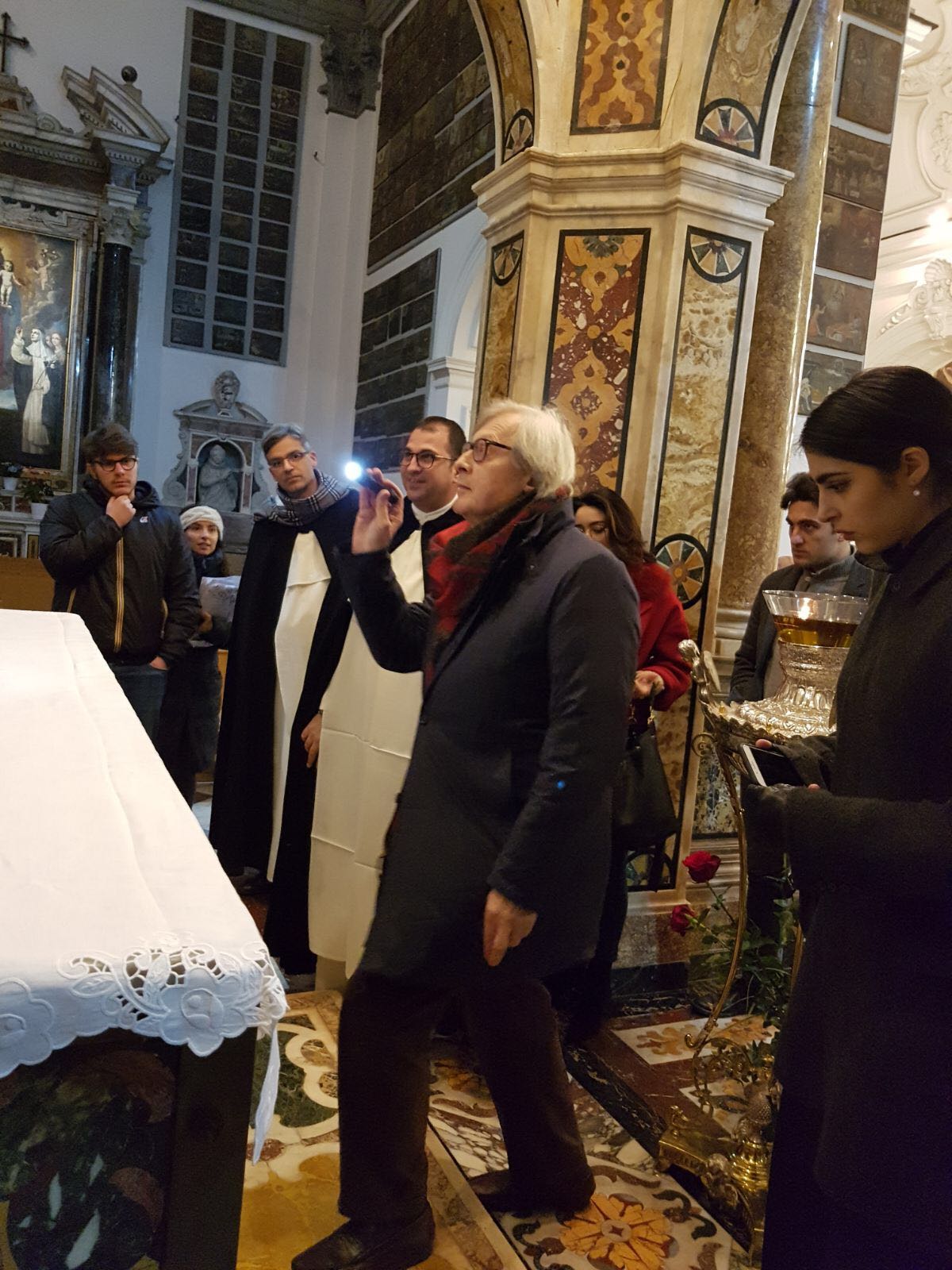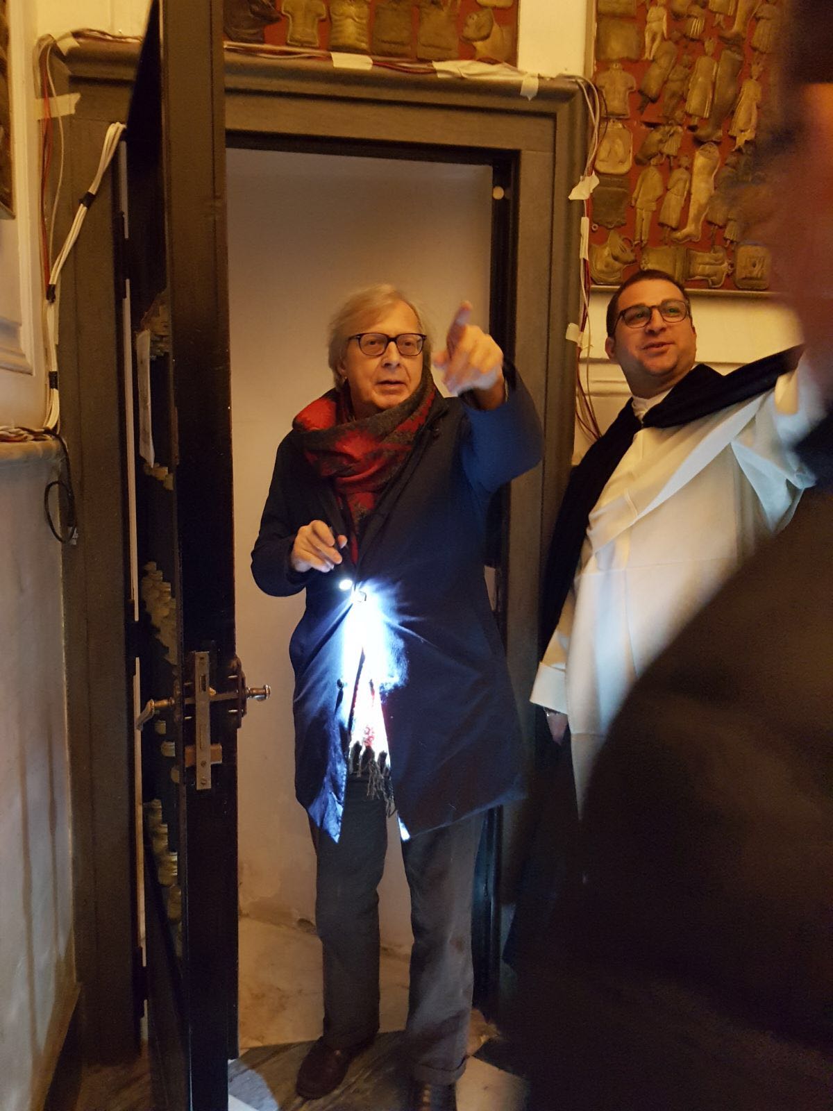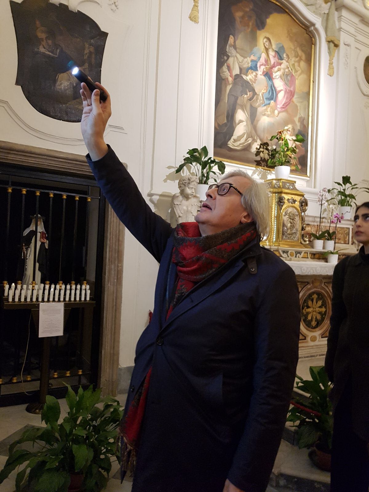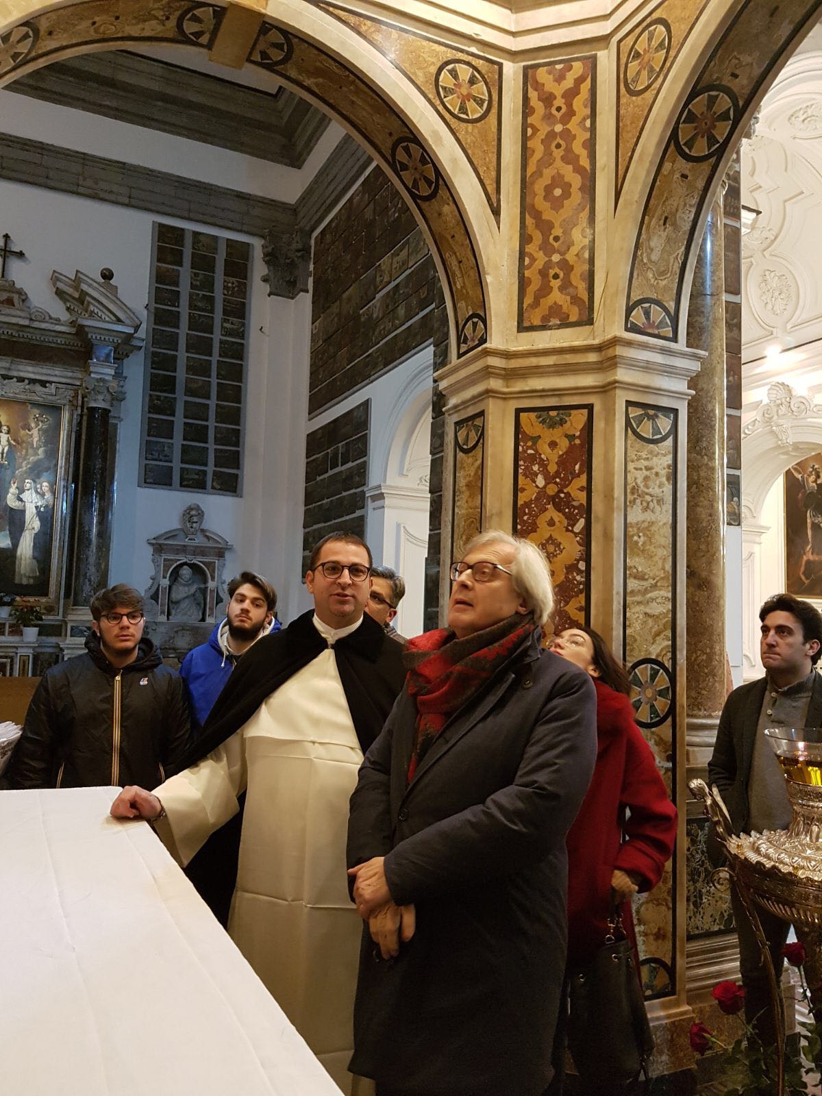 Una pausa dalla campagna elettorale per il critico d’arte Vittorio Sgarbi che ha voluto visitare, senza clamori e senza seguito, il Santuario di Madonna dell’Arco a Sant’Anastasia. Ha contattato il rettore del convento domenicano, padre Alessio Romano, e nella serata di ieri ha trascorso più di un’ora ad ammirare le tavolette votive del Santuario, famose in tutto il mondo, ha osservato il chiostro, contemplato l’antica farmacia dai soffitti affrescati e ha ricevuto in dono i volumi che illustrano la storia e le ricchezze del Santuario dedicato alla Vergine dell’Arco.