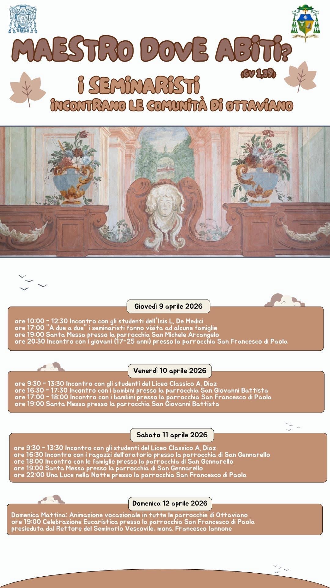 Il percorso si concluderà domenica 12 aprile con l’animazione vocazionale in tutte le parrocchie di Ottaviano e con la celebrazione eucaristica presso la parrocchia di San Francesco di Paola, presieduta dal rettore del seminario vescovile, mons. Francesco Iannone.