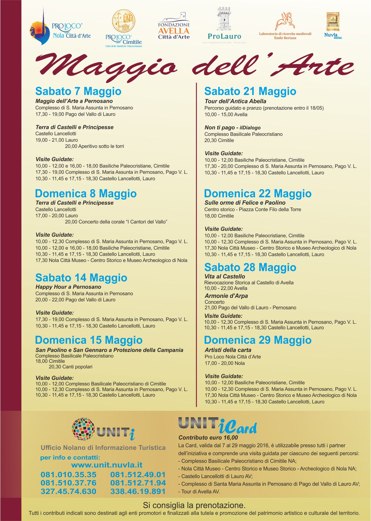 A partire da sabato 7 fino a domenica 29 maggio sarà possibile ritirare una card presso ciascuno dei partner coinvolti, con cui ogni visitatore potrà essere accompagnato alla scoperta del complesso di Santa Maria Assunta in Pernosano – Pago del Vallo di Lauro (AV), delle Basiliche Paleocristiane di Cimitile (NA), del Castello Lancellotti a Lauro (NA), del centro storico e del Museo Archeologico di Nola (NA), dei maggiori monumenti di Avella (AV), secondo il programma stabilito. Oltre alle visite guidate, ci saranno poi una serie di eventi e manifestazioni curate dalle singole associazioni, tra cui spicca la collaborazione con il risto-bistrò culturale La Festa dei Folli, che andranno ad arricchire il congiunto “Maggio dell’Arte” con proposte pensate per offrire momenti di svago e di intrattenimento per tutti.