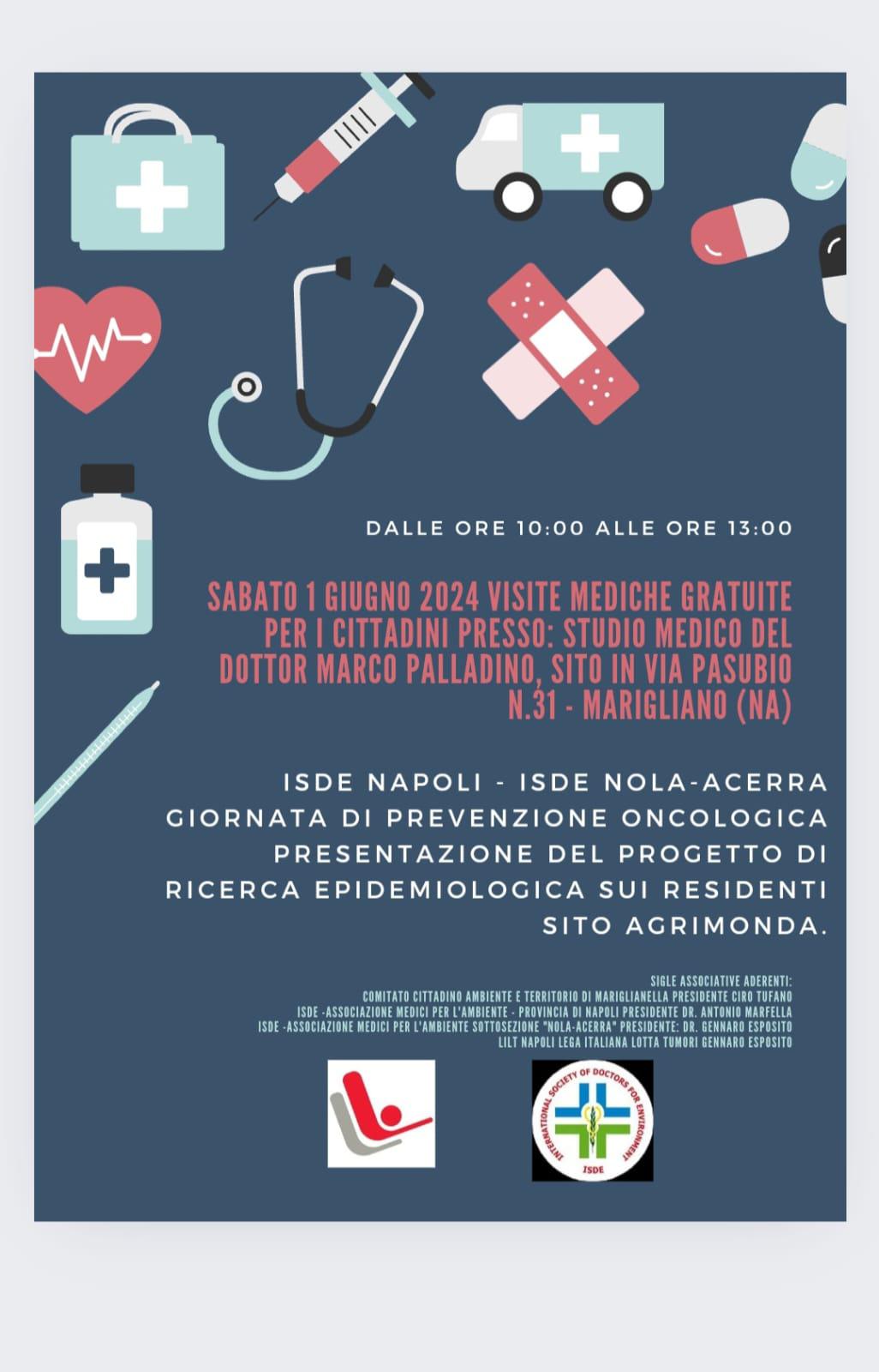 Mariglianella (NA) – I Medici per l’Ambiente della sezione ‘Nola-Acerra’ e provincia di Napoli, unitamente alla LILT (Lega Italiana Lotta Tumori) e al Comitato Cittadino ‘Ambiente e Territorio’ di Mariglianella, hanno promosso per SABATO 1 GIUGNO 2024, DALLE ORE 10 ALLE OE 13, UNA GIORNATA DI PREVENZIONE ONCOLOGICA con visite GRATUITE riservate, in primis, ai residenti del sito ‘AGRIMONDA S.r.l.’ nei pressi della statale 7 bis, a confine con Marigliano. Le visite saranno effettuate presso l’ambulatorio medico del Dottor Marco Palladino in via Pasubio, 31 Marigliano e riguarderanno la ricerca di tumori della pelle ed ecografie mammarie per la prevenzione e diagnosi di neoplasie del seno. A sottoporre a visita i volontari i Dottori Antonio Marfella, oncologo del Pascale, e Michele Pizzorusso, già senologo dello stesso Istituto. A seguire CONFERENZA STAMPA con la PRESENTAZIONE DELLO STUDIO EPIDEMIOLOGICO SU UN CAMPIONE DELLA POPOLAZIONE RESIDENTE NEI PRESSI DEL SITO CONTAMINATO, a seguito dell’incendio, avvenuto nel luglio del 1995, di un deposito di pesticidi, fitofarmaci e concimi fertilizzanti, messo in sicurezza, ma mai bonificato radicalmente. “L’indagine che svolgeremo – ha spiegato il presidente Marfella – sarà finanziata dalla LILT e servirà per verificare se i residenti adiacenti al sito hanno subito significative contaminazioni di sostanze tossiche derivate dall’esposizione per via aerea e nella falda acquifera superficiale e profonda”. “I dati dell’Atlante epidemiologico regionale – spiega Gennaro Esposito – indicano che nei comuni di Marigliano, Mariglianella e Brusciano sono state registrate le percentuali più alte di incidenza e mortalità per cancro della Regione Campania. Per questo bisogna agire a tutela della salute dei cittadini”. Darà la benedizione all’iniziativa, perché da sempre sensibile alle tematiche ambientali a tutela della salute pubblica, Don Peppino Gambardella, parroco della Chiesa di Faibano di Camposano.