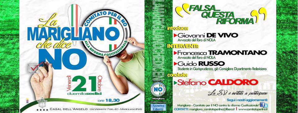 “Falsa questa riforma”: in vista del referendum del 4 dicembre il comitato Marigliano per il No alla riforma costituzionale e l’associazione “Azzurra Libertà” organizzano un dibattito in programma per le 18,30 di venerdì 21 ottobre.