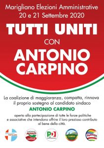 “In vista delle prossime elezioni amministrative del 20 e 21 Settembre 2020, il Partito Democratico di Marigliano, unitamente a tutta la coalizione politica, rinnova la propria fiducia ed il proprio sostegno al candidato Sindaco Antonio Carpino.