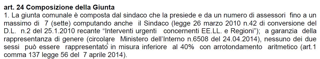 Come riporta lo stralcio dell’articolo in questione, solo due cose potranno accadere con una eventuale modifica: l’aggiunta di un assessore (l’oggetto del contendere, in questo caso, potrebbe essere la presenza o meno di Michele Cerciello di Impegno Civico nella squadra assessoriale), oppure il taglio di una figura femminile, prevista dalla legge in misura non inferiore al 40%.