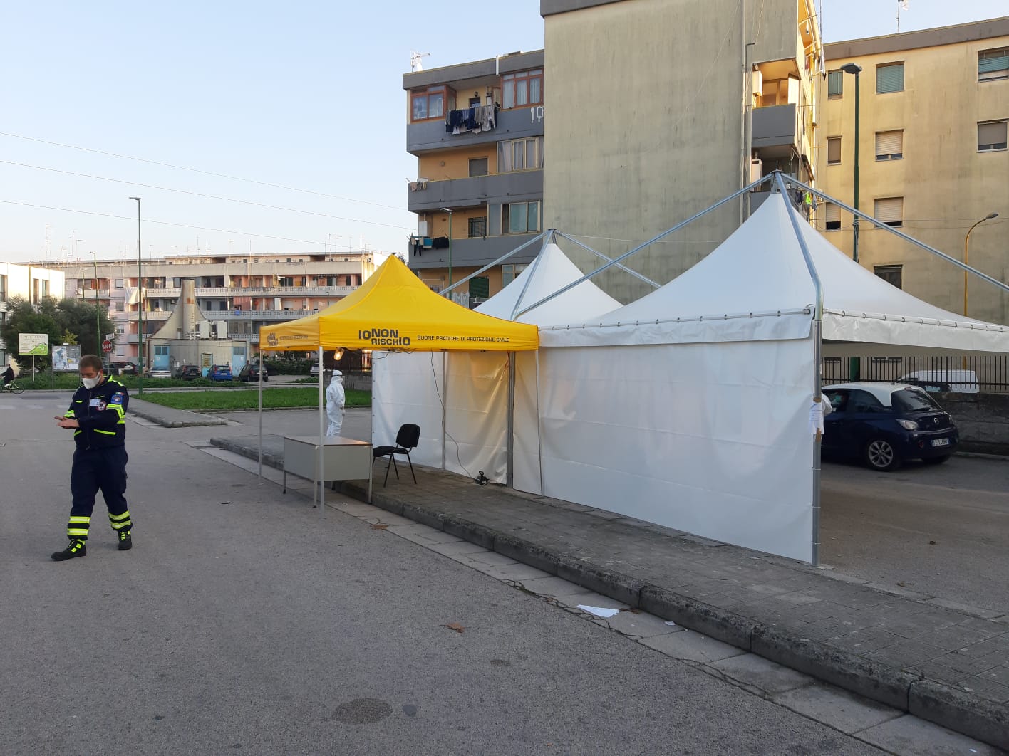 (in foto l’allestimento del terzo gazebo per il drive in a cura di Salamandra – Nucleo Operativo di Emergenza)