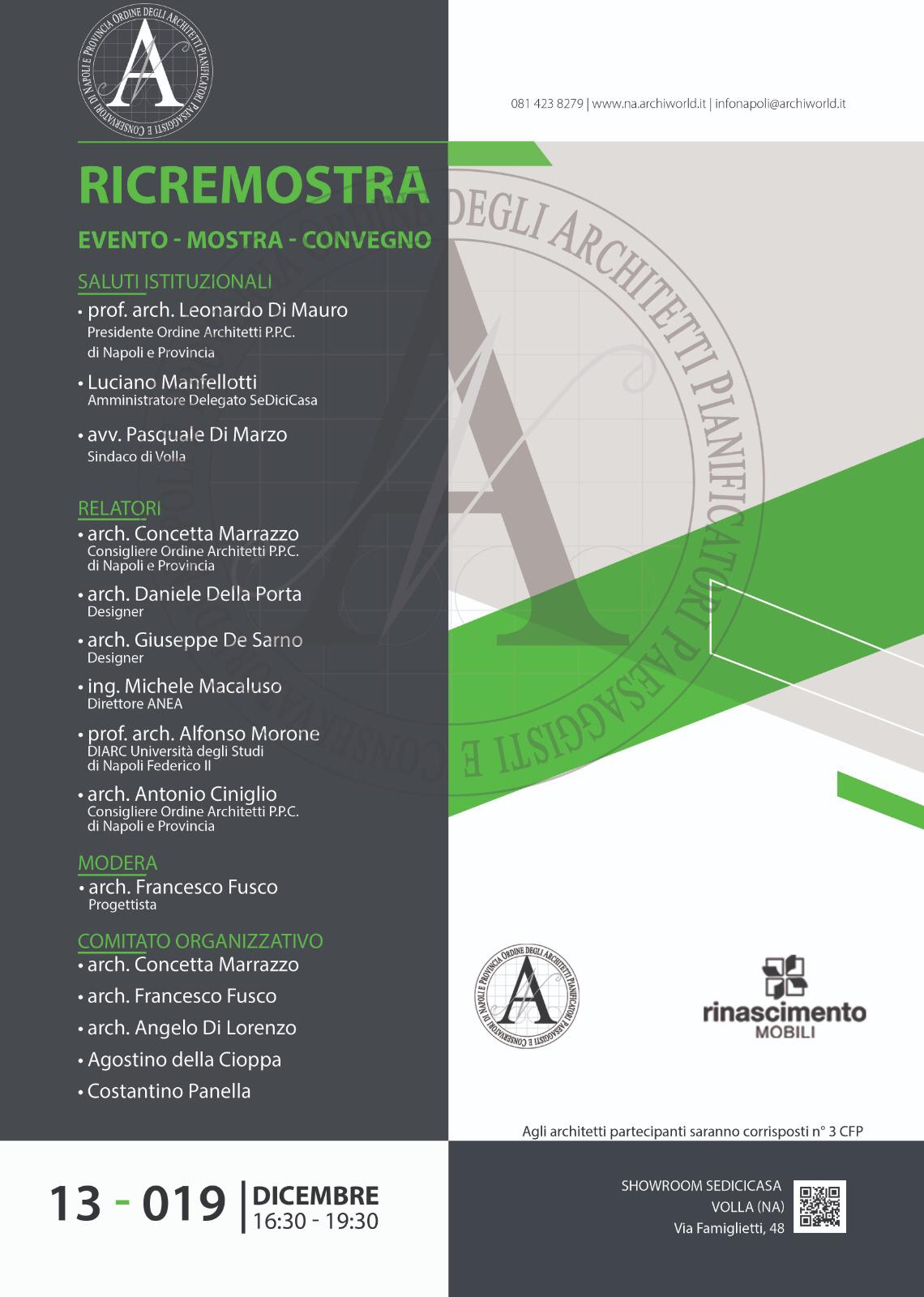 ” Si è conclusa venerdì 10 gennaio l’evento RICREMOSTRA, promossa dall Ordine degli architetti di Napoli e provincia. La mostra é stata inaugurata a dicembre con un convegno che ha visto la partecipazione di un comitato organizzativo composto dagli Architetti Concetta Marrazzo, Francesco Fusco, Angelo Di Lorenzo, Agostino della Cioppa, Costantino Panella in collaborazione con Rinascimento Mobili.