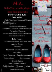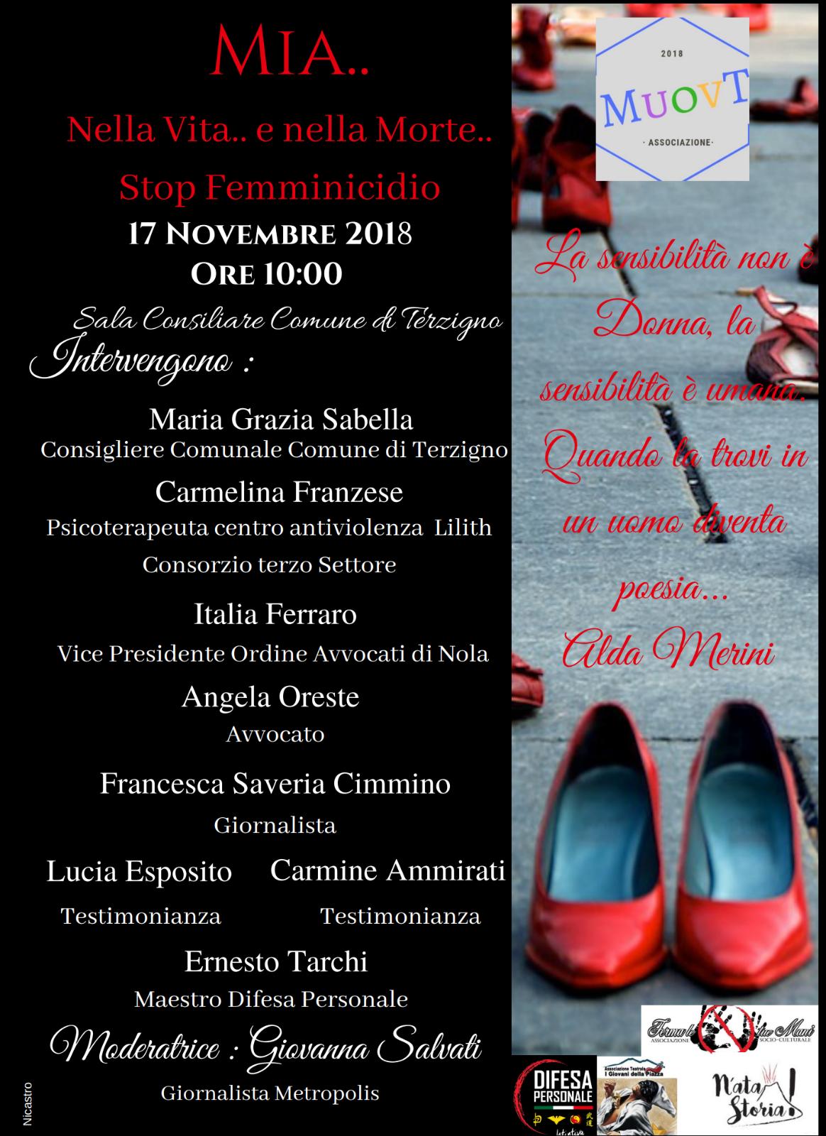 Si terrà sabato 17 novembre a partire dalle 10, presso la sala consiliare del Comune di Terzigno, un convegno contro il femminicidio, “Mia… nella vita e nella morte”. L’evento è promosso dall’Associazione “Muovt”, particolarmente attiva sul territorio vesuviano.