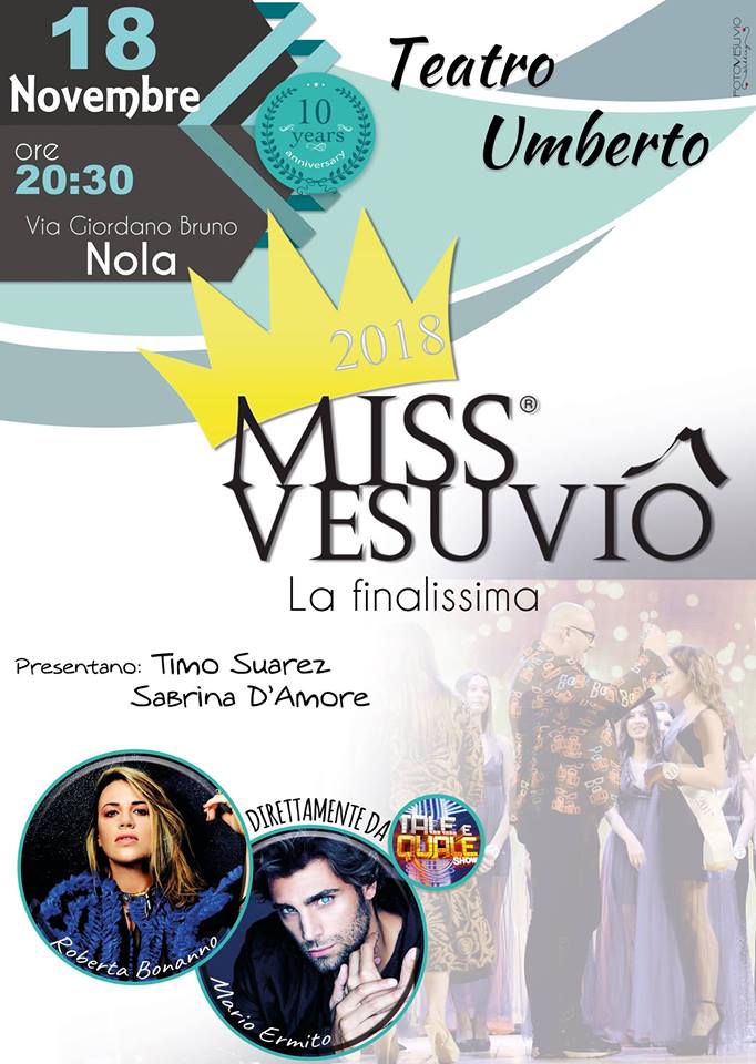 Le ultime sfilate sotto gli occhi del pubblico attento, gli ultimi scatti fotografici, gli ultimi applausi, poi la grande festa. Domenica sera a partire dalle ore 20:30 presso il Teatro Umberto di via Giordano Bruno a Nola sarà ospitata la finalissima dell’edizione 2018 di Miss Vesuvio, il concorso di bellezza che quest’anno festeggia dieci anni di vita e di successi. Quello di domenica sarà l’ultimo atto di un percorso lungo, che ha toccato negli scorsi mesi diverse località dell’intera regione Campania, regalando spettacolo e divertimento al pubblico e importanti occasioni per mettersi alla prova nel mondo delle sfilate a tante ragazze e giovani donne. Tra le tappe più seguite dell’edizione 2018 quelle a San Giorgio a Cremano, Ercolano, Torre del Greco, Castellammare di Stabia, Scafati, Ottaviano, Aversa, San Cipriano, Pozzuoli, Bacoli, Centro Commerciale Neapolis. Il gran finale, invece, è domenica a Nola: qui si sfideranno Adelaide Castaldo, Marika De Rosa, Rossana Romano, Valeria Turco, Sabrina Russo, Anastasia Musella, Sara Olimpico, Tonia Terracciano, Marina Cappiello, Giorgia Siniscalchi, Mayra Gagliardo, Erica Cimmino, Noemi D’Ardia, Martina Olimpico, Maria Francesca Cafiero, Federica Amoroso, Roberta Buoncammino, Rossella Scognamiglio, Martina Solferino, Martina Alfano, Tonia Capasso, Teresa Sciarra e Asya Iossa. Ventitré sfidanti per un’unica corona, quella che sarà apposta al capo della più bella delle belle, che succederà a Martyna Carrano, la reginetta uscente. Ospiti d’onore dell’ultima serata, che sarà presentata da Tino Suarez e Sabrina D’Amore, saranno, direttamente dalla fortunata trasmissione di Rai 1 Tale e Quale Show, nel corso della quale si sono fatti apprezzare dal pubblico italiano, l’attore Mario Ermito, già vincitore del titolo di “Modello più bello d’Italia” e attore nelle fiction “Il peccato e la vergogna”, “L’onore e il rispetto”, “Il bello delle donne”, e Roberta Bonanno, cantante seconda classificata alla settima edizione di Amici e fresca vincitrice del Premio Mia Martini 2018. Saranno loro, con le doti, la simpatia e le qualità che abbiamo imparato ad apprezzare nello show condotto da Carlo Conti, a impreziosire l’ultimo capitolo di Miss Vesuvio, manifestazione ideata da Nicola Pinto e Anna Maione che come sempre si avvale di partner d’eccezione, quest’anno la YourWay Management, agenzia di moda romana, e La Ribalta, Scuola di formazione cinematografica a Castellammare di Stabia e Napoli.