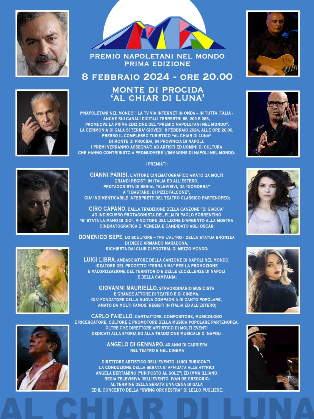 Riconoscere e premiare le eccellenze di Napoli. E’ l’obiettivo della prima edizione del premio “Napoletani nel Mondo”, che si è svolgerà giovedì 8 febbraio presso il complesso turistico ‘Al Chiar di Luna ‘ di Monte di Procida (via Amedeo, 89).