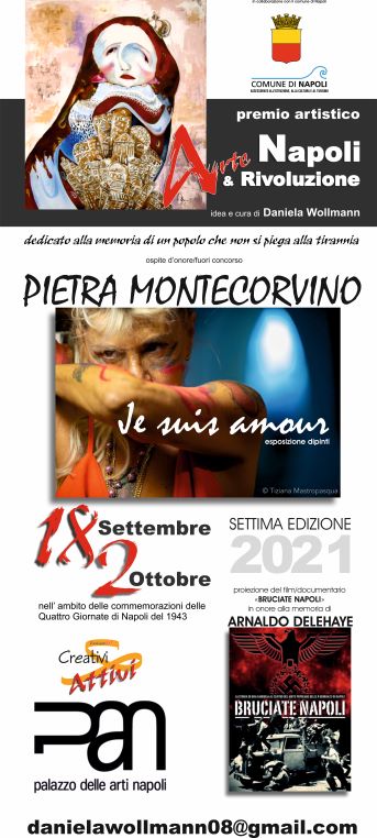 Giunto ormai alla settima edizione, il premio 2021 sarà dedicato alla memoria del regista Arnaldo Delehaye e in suo onore verrà proiettato il film “Bruciate Napoli” per tutta la durata del premio. A fare da apripista alla mostra, domenica 19 settembre alle ore 18, l’artista Pietra Montecorvino presenterà “Je suis amour”, un percorso espositivo – fuori concorso – dei suoi lavori pittorici, dall’omonimo titolo del suo ultimo e recentissimo singolo musicale.