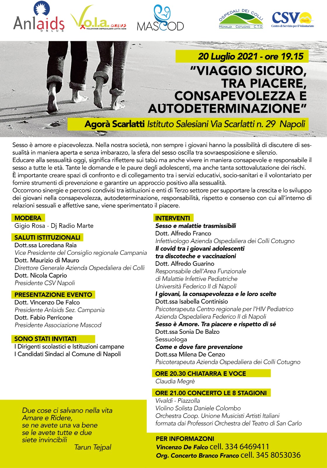 L’evento si terrà il 20 luglio alle 19,15 all’Agorà Scarlatti – Istituto Salesiani di via Scarlatti 29, a Napoli e sarà un’occasione di confronto sui temi della sessualità che si coniugherà con la buona musica. Dopo i saluti istituzionali di Loredana Raia (Vicepresidente del Consiglio regionale della Campania), Maurizio Di Mauro (Direttore generale dell’Azienda ospedaliera dei Colli) e Nicola Caprio (Presidente di CSV Napoli), ci sarà la presentazione dell’evento da parte del Presidente di Anlaids sezione Campania, Vincenzo De Falco e del presidente di Mascod, Fabio Perricone.