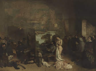 Due anonime “signorine”, di quelle che Courbet incontrava ogni giorno per strada – e dunque non due dee dell’Olimpo, né due principesse – si riposano lungo la riva della Senna. E non parlano né con il fiume, né con gli alberi, come avrebbero immaginato un pittore accademico e un pittore “neoclassico”: cercano solo di salvarsi dal caldo, e perciò Courbet ci ricorda, già nel titolo, che era estate. I gesti e l’espressione delle due “signorine” rivelano – ha scritto il critico Attilio Bertolucci –“una certa animalità malinconica, un certo peso grave del corpo” che rappresentano “qualcosa di nuovo nell’arte del secolo, fanno pensare a Baudelaire e a Flaubert”. Nel 1854 Courbet aveva cominciato a lavorare all’Atelier del pittore (immagine in appendice), in vista dell’Esposizione Universale del 1855. Il quadro è il manifesto della sua poetica, ma, a causa delle grandi dimensioni, venne rifiutato dal Salon. Questo rifiuto portò Courbet a rispondere, nello stesso anno, con l’allestimento del “Padiglione del Realismo”, come decise di chiamare l’esposizione da lui costruita in Avenue Montaigne, a pochi passi dall’Esposizione dedicata alle Belle Arti: una sfida all’ Accademia e ai suoi precetti.. La scena di questo quadro è del tutto nuova nella storia della pittura: pare quasi che il pittore osservi di nascosto le due signore, che, ignorando di essere spiate, si distendono, senza grazia, in posizioni poco eleganti: una scena non infrequente sulle rive della Senna. Il difetto di grazia e di decoro, il disinteresse per la bellezza del luogo che le “demoiselles” ostentano e il cappello che “si stende” sulla testa di una delle due signore hanno indotto quasi tutti i critici a pensare che esse siano due prostitute: il particolare sottolinea in modo ancora più vigoroso il realismo della scena. Il disinteresse e la requie dei volti vengono esaltati, per contrasto, dall’intreccio delle linee create dalle pieghe delle vesti e dal sovrapporsi delle foglie, così come il bianco della veste della “dormiente” – il bianco “spinto in avanti” dalle velature di blu cobalto – porta luce nel cono d’ombra creato dai rami fronzuti e dalla veste dell’altra signora, “costruita” con un fondo in ocra scura, velato, dopo che si era asciugato, con brevi tratti di rosso e “chiamato” a far contrasto con il verde delle foglie. Courbet usò una tela col fondo in ocra chiara, dipinse i volti delle signorine con sottili pennellate di bianco di piombo in cui era stata diluita una “punta” di rosso ossido di ferro, realizzò la superficie delle foglie con sapienti tocchi di uno straccio accartocciato bagnato nel colore. In ogni caso, il disegno è ancora fondamentale per Courbet, soprattutto per suggerire all’osservatore la profondità dello spazio in cui è collocata la scena: compito che in questo quadro è affidato alla barca all’ancora nel fiume, spinta in avanti, nella nostra percezione, dal fascio di fiori che copre la parte centrale del corpo della signora in rosso e che permette al pittore di non disegnare quell’intreccio di pieghe che avrebbe bloccato il nostro sguardo e ci avrebbe impedito di cogliere la profondità della scena. Dunque, Courbet completava nello studio ciò che incominciava a dipingere a “plein air”, all’aria aperta. Leggo da qualche parte che egli si proponeva di rappresentare la “cruda” realtà: ma l’aggettivo non lo condivido. Egli voleva liberare la pittura dagli artifici dell’accademia e rappresentare la realtà vera, che non sempre è cruda. “Ho cinquant’anni e sono sempre vissuto libero; lasciatemi finire libero la mia vita; quando sarò morto voglio che questo si dica di me: non ha fatto parte di alcuna scuola, di alcuna chiesa, di alcuna istituzione, di alcuna accademia e men che meno di alcun sistema: l’unica cosa a cui è appartenuto è stata la libertà”. La lezione di questo Maestro giunse a Napoli “portata” dai pittori napoletani che le ragioni della cultura e del mercato invitavano a recarsi a Parigi: e fu una lezione duratura e preziosa, come cercheremo di spiegare.