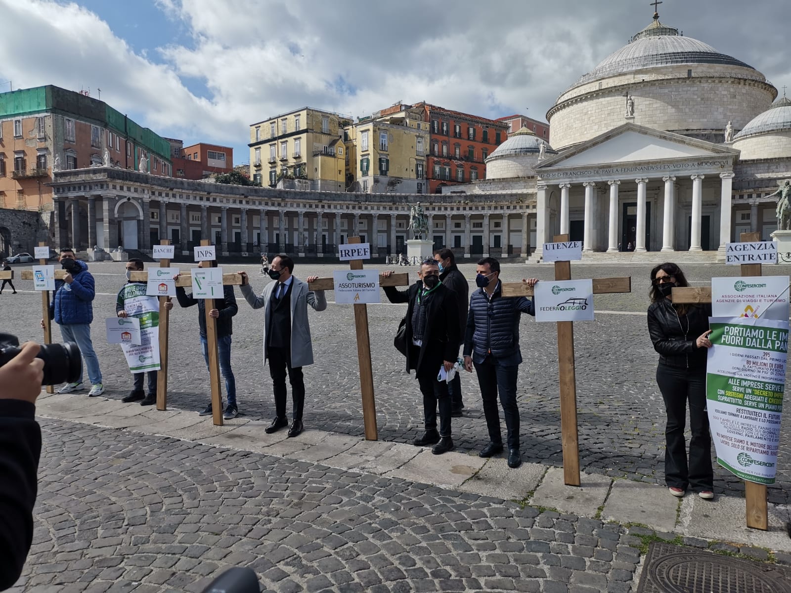 Si è tenuta questa mattina a Napoli la manifestazione di protesta organizzata da Confesercenti Campania: in piazza del Plebiscito sono state esposte 15 croci (portate sulle spalle dai vari rappresentanti delle categorie commerciali), che rappresentano 15 costi insostenibili per le aziende campane. Su ogni croce era riportato l’afflizione economica insopportabile per gli esercenti della nostra regione: dall’Iva alle pressioni dell’Agenzia delle Entrate, dall’Irap, Imu,Tari, Ires, Irpef alle cartelle esattoriali, dai fitti e dalle utenze alle altre gravose tasse, dalle esposizioni con le banche allo spettro della malavita. Sono state anche raccolte oltre 5000 firme per la petizione per “far ripartire le imprese”, consegnata al Prefetto di Napoli (e sottoscrivibile sul sito www.confesercenti.it). «Dobbiamo portare le imprese fuori dalla pandemia. Confesercenti – sostiene il presidente di Confesercenti Campania e delegato alle politiche del Mezzogiorno Vincenzo Schiavo – chiede al Governo di varare un decreto legge per gli imprenditori, un “Decreto Imprese” che dia risposte concrete, reali e certe alle nostre aziende, con sostegni adeguati di almeno il 30% rispetto al fatturato perso. Abbiamo bisogno di garantire credito immediato per tutti gli imprenditori, anche per chi ha le segnalazioni al Crif (ovvero è nell’elenco dei cosiddetti “cattivi pagatori”). Chiediamo un “anno fiscale bianco”, perché le nostre imprese non sono in grado di sostenere i costi fissi, le tasse, i fitti e le utenze, avendo zero incassi. Le imprese campane perdono circa 1 milione di fatturato al giorno, 50 miliardi sono stati bruciati in un anno (dai 93 del 2019 si è passati ai 43 del 2020). Con la petizione chiediamo altresì anche ai parlamentari campani di intervenire in modo immediato. Rimettiamo idealmente le licenze nelle mani del Presidente della Repubblica Sergio Mattarella, in modo che intervenga per restituire dignità alle nostre attività».