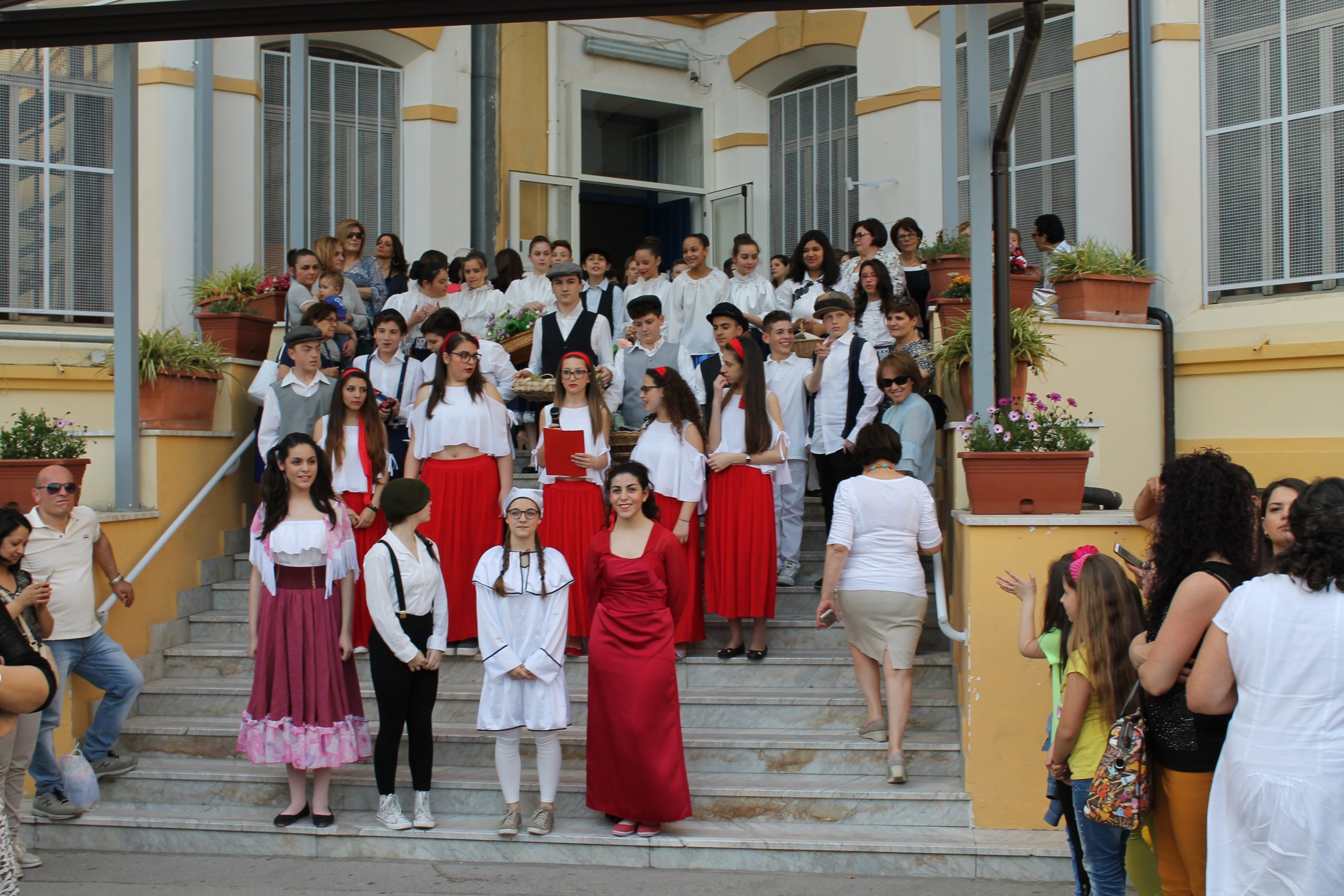 E così è stato. Sullo sfondo di un meraviglioso scenario, il golfo di Napoli, (bellissimo striscione stilizzato), in uno sfavillio di colori e sulle note di un mix di canzoni napoletane, fanno il loro ingresso, in una parata incantevole, gli alunni dell’Infanzia. Subito dopo le classi quinte del capoluogo intonano e ballano ” Gente, magnifica gente ” e ” ‘A città ‘e Pulicinella”. Tornano di nuovo in scena gli alunni dell’ Infanzia con una coreografia a dir poco esilarante , prima con la canzone del Babà, poi con i ritmi della tarantella, infine, in una scena emozionante, con le note meravigliose di “Napul’ è..” di Pino Daniele. Gli alunni delle quinte di Carbonara e Vico si esibiscono nelle vesti degli scugnizzi di “Persone,Persone”, la canzone di Sal Da Vinci e concludono la loro performance con ” Don Rafaè “, nella versione di Clementino. È il turno degli alunni della scuola secondaria di primo grado che si esibiscono in un breve musical tratto dal film “Totò, sapore e la magica storia della pizza”. Lo scenario è piazza Mercato , con il suo pullulare di gente e bancarelle. Protagonisti Totò e Confianse, Pulcinella, Vesuvia e le voci , i suoni ,i rumori, gli umori che rendono Napoli una città unica. L’ atmosfera è magica, il pubblico è completamente preso, scrosci di applausi accompagnano l’esibizione.