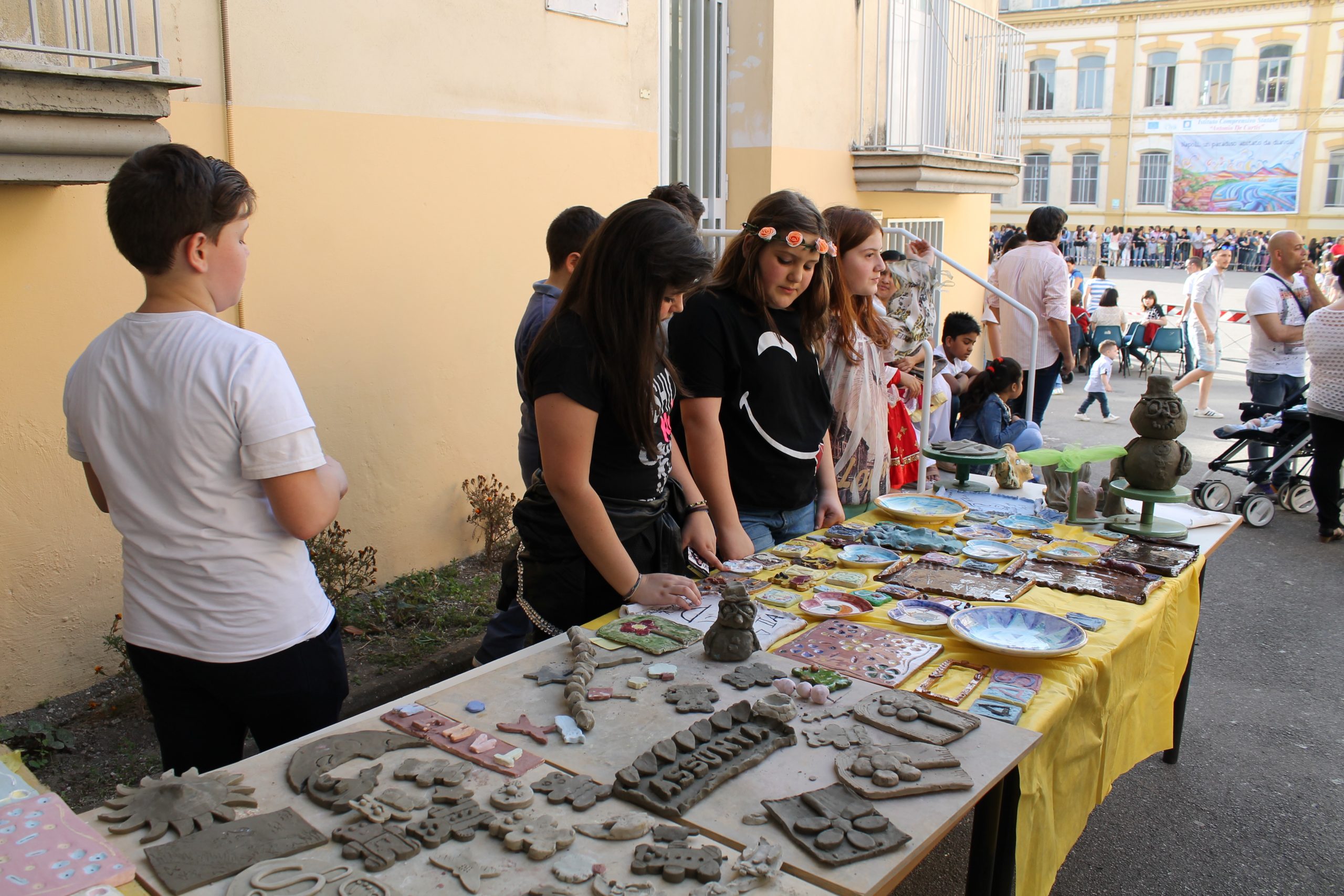 Il ringraziamento più caloroso la signora Dirigente lo dedica ai veri protagonisti, gli alunni, che nello spettacolo hanno messo tutta la forza sfavillante, vulcanica, di quella passione intelligente che è il segno magico della civiltà napoletana. Infine la folla intervenuta confluisce verso i gazebo dei dolci, dei rustici, delle bevande, offerti dai genitori, e ai banchi dei manufatti in porcellana (foto in appendice), realizzati dagli alunni della secondaria di primo grado.