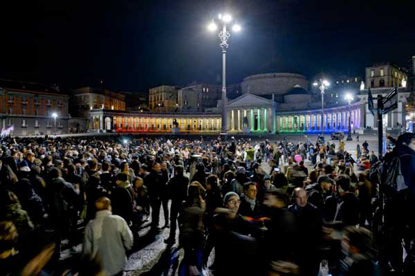 Il corteo ha sfilato per le vie di Napoli e ha raggiunto Piazza del Plebiscito, illuminata con i colori dell’arcobaleno.