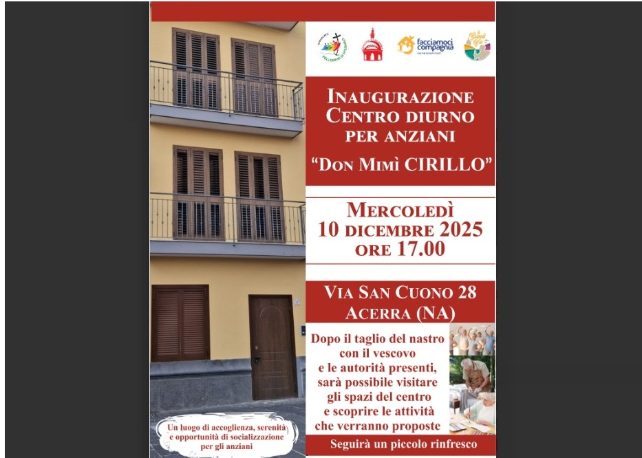 E’ il Centro diurno per anziani “don Mimì Cirillo”, nel cuore di Acerra, in pieno centro storico, per contrastare la solitudine crescente tra le persone avanti con l’età e offrire loro spazi di socialità, relazioni autentiche, impegno attivo.