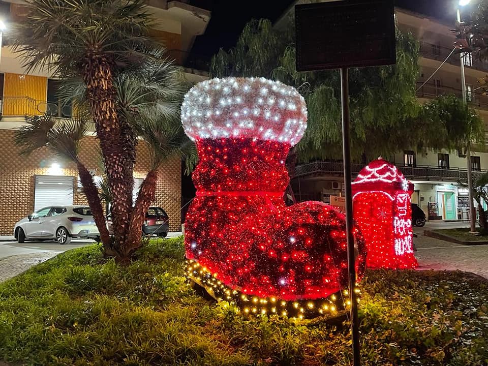 Infine, altro paese molto illuminato per questo Natale è indubbiamente Madonna Dell’Arco con luminarie dal colore rosso, colore assolutamente predominante, come la grande calza della befana, il cappello di Babbo Natale e il piccolo villaggio natalizio recintato.
