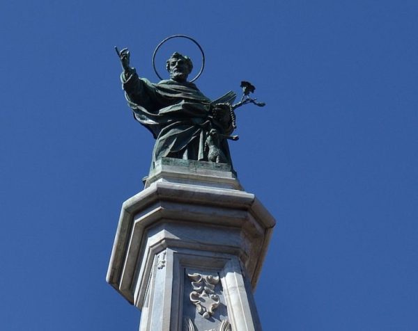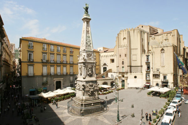 A Piazza San Domenico trovi tutti i segni della grandezza di Napoli antica: si affacciano sulla piazza palazzi di nobili famiglie, e in uno di questi ebbe sede, dal 1698 al 1806, il Banco del Salvatore, che svolse un ruolo importante nella storia economica e sociale della città; e poi c’è la chiesa dei Domenicani, la basilica, nella quale ogni pietra è un capitolo di storia.Nel 1657 gli “Eletti” di Napoli deliberarono di contribuire con un generoso “donativo”- 500 ducati- alla realizzazione di un progetto dei Padri Domenicani, che avevano deciso di innalzare una Guglia per ricordare la protezione accordata da San Domenico al popolo flagellato dalla peste dell’anno precedente. I lavori incominciarono nel 1658 e i primi scavi portarono immediatamente alla luce quei resti di mura greche che nel 1692 vennero descritti da Carlo Celano. Francesco Antonio Picchiatti, che dirigeva i lavori, scese due volte negli scavi e ne disegnò anche una pianta, che venne conservata da Francesco Enrico Grasso, conte di Pianura. Alcuni studiosi sostennero che fossero i resti della Porta Cumana, ma questa tesi non venne condivisa da Bartolomeo Capasso: la polemica durò a lungo, ma nessuno è riuscito a produrre prove capaci di dare una risposta definitiva. I resti, immediatamente ricoperti, vennero ritrovati nell’aprile del 1943 – un terribile aprile di guerra – dagli operai di una ditta che era stata incaricata di installare una vasca idrica nella piazza. Amedeo Maiuri, che era il Soprintendente alle Antichità,spiegò al podestà di Napoli, Giovanni Orgera, l’importanza di quel ritrovamento e cercò in ogni modo di convincerlo a autorizzare e a finanziare uno scavo sistematico di quelle preziose vestigia di Napoli antica, ma ogni tentativo si infranse contro la tragica gravità del momento storico e contro il vuoto delle casse comunali. Le lettere che si scambiarono Maiuri e il podestà, ritrovate in archivio dalla dott.ssa Maria Oreto, sono state pubblicate da Gianpasquale Greco. I lavori per la costruzione della base della Guglia si conclusero tra il 1668 e il 1670. In seguito, Francesco Antonio Picchiatti venne sostituito da Cosimo Fanzago, a cui toccò il compito di rivestire di marmi la struttura e di configurare i marmi in forme decorative originali. Secondo Renato Ruotolo, fu proprio il Fanzago a disegnare a forma di piramide la parte terminale della Guglia, e dalla sua bottega uscirono le due Sirene, gli stemmi della città di Napoli, dell’Ordine Domenicano, del Re di Spagna e del viceré Pietro Antonio d’Aragona.Il Fanzago venne poi sostituito da Lorenzo Vaccaro, non si sa con certezza per quali ragioni: forse per l’eccessiva lentezza del lavoro. Dopo una lunga interruzione, imposta dagli eventi politici e militari del primo trentennio del’700, nel 1736 Domenico Antonio Vaccaro, figlio di Lorenzo, avviò la fase degli interventi che avrebbe portato a termine la costruzione della Guglia. Secondo il Ruotolo, Domenico Antonio guidò l’opera del “marmoraro” Giovan Battista Massotti e scolpì in marmo la statua di San Domenico che, fusa in bronzo, fu posta sul vertice della struttura (vedi immagine in appendice). Vincenzo Maria Perrotta, dell’Ordine dei Predicatori, così scrive nel libro che egli pubblicò nel 1828 sulla storia della Chiesa di San Domenico: Domenico Antonio Vaccaro sulla sommità della Guglia “piantò una bellissima statua di bronzo di San Domenico, alta palmi 13, fatta col suo disegno, modello e assistenza e maestrevolmente scolpita con bella azione, con bizzarre pieghe dell’abito e che spira devozione. E sebbene scorgasi molta differenza tra i lavori del Fanzago e quelli del Vaccaro, la grande opera non lascia di comparire maestosa e vaga, essendo sobriamente ricca di statue, medaglioni, bassorilievi, con altri capricciosi ornamenti, tutti di marmo bianco e giallo antico, assai ben accordati”. Il Massotti completò e collocò sulla Guglia i quattro “puttini” delle mensole che chiudono la base e i “medaglioni” di San Pio V, di Sant’ Agnese e di Santa Margherita, e sui disegni di Domenico Antonio Vaccaro, scolpì anche i busti degli altri Santi domenicani: Vincenzo Ferrer, Giacinto, Pietro Martire, Ludovico e Raimondo.