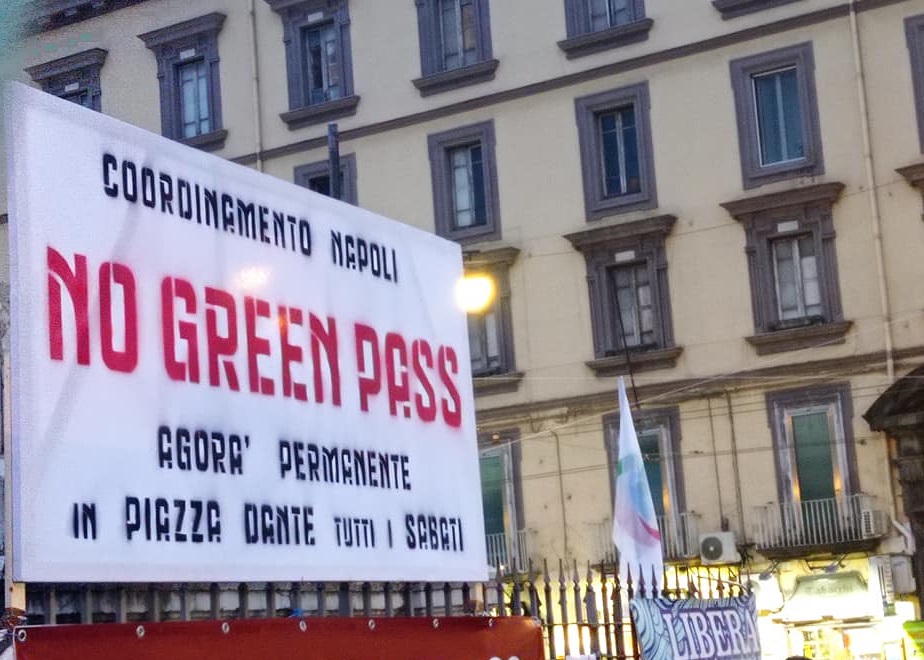 “Lo faremo sabato prossimo” annuncia al microfono un esponente del coordinamento, ma una parte della piazza vuole farlo subito. Tra le due piazze, le parole d’ ordine sono le stesse: no all’odiato lasciapassare verde, libertà di vaccinarsi o meno, libertà di lavoro, dimissioni del governo Draghi e del ministro Speranza. Su un banchetto si raccolgono firme per una proposta di legge di iniziativa popolare per “l’abolizione immediata dello stato di emergenza”. Sventolano bandiere del Regno delle Due Sicilie, ma si vedono anche cartelli che chiamano alla “unità proletaria contro il capitale”.