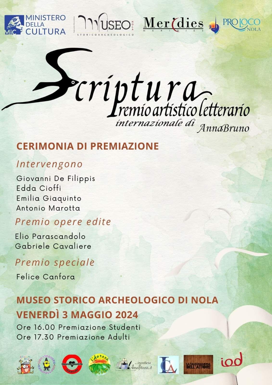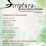 Venerdì 3 maggio, presso il Museo Storico Archeologico di Nola, si svolgerà la cerimonia di premiazione dei vincitori del Premio Artistico Letterario Internazionale “Scriptura”, ideato e curato da Anna Bruno.