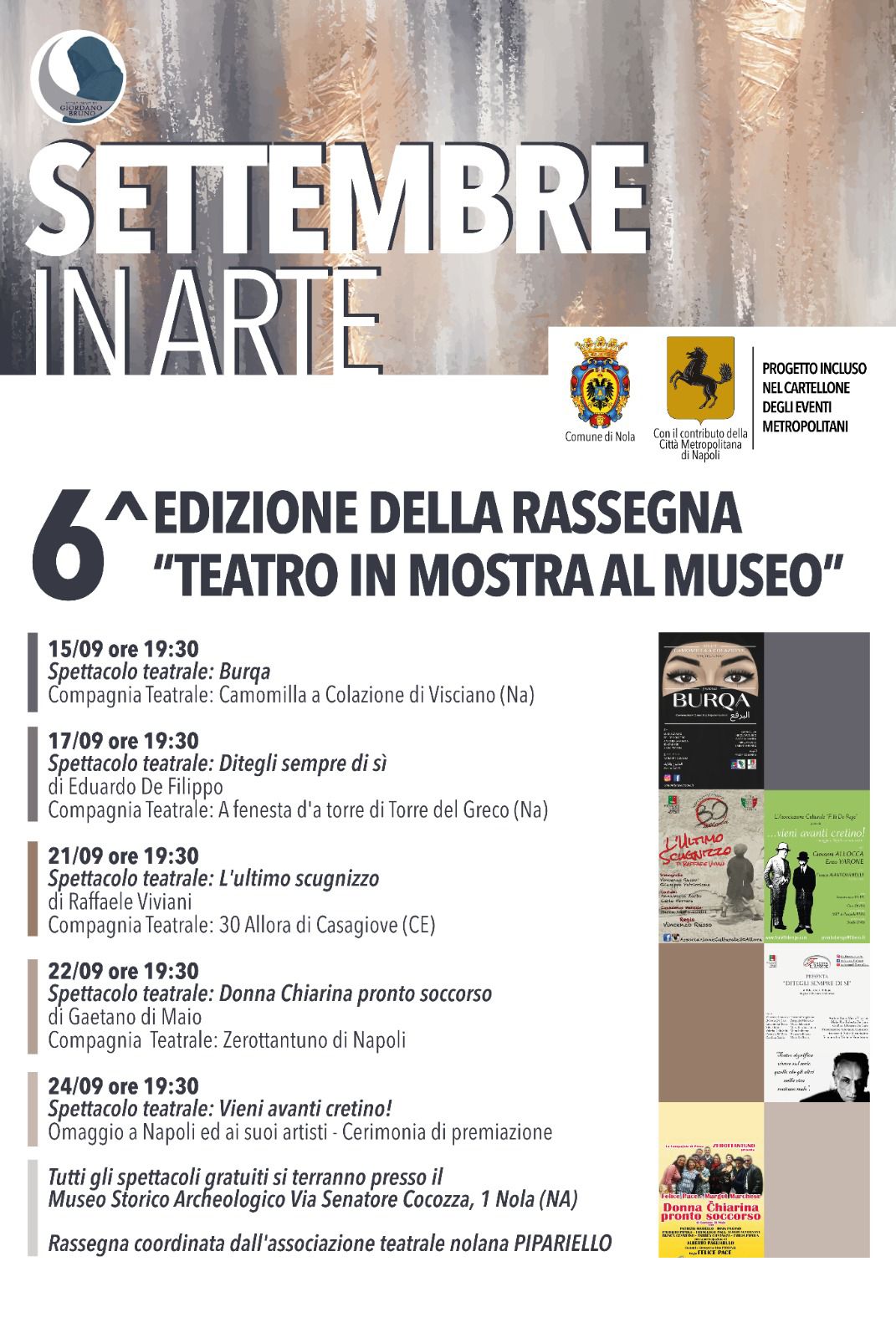 Sipario sull’edizione numero 6 della rassegna “Teatro in mostra al museo” in corso a Nola dal 15 settembre 2023. L’evento, che si concluderà il 24 e che si terrà nei saloni del museo storico archeologico di via Senatore Cocozza, arricchisce il cartellone culturale “Settembre in arte”, che si interseca con il progetto “Sulle orme di Giordano Bruno” attraverso il quale l’amministrazione comunale di Nola, guidata dal sindaco Carlo Buonauro, ha scelto di valorizzare le vocazioni del territorio con una formula che lega a doppio filo i luoghi del filosofo il cui pensiero resiste al passaggio del tempo e continua a rappresentare uno stimolo per accademici e studiosi internazionali, le tradizioni storiche ed artistiche della città, le eccellenze artistiche, produttive ed agricole.