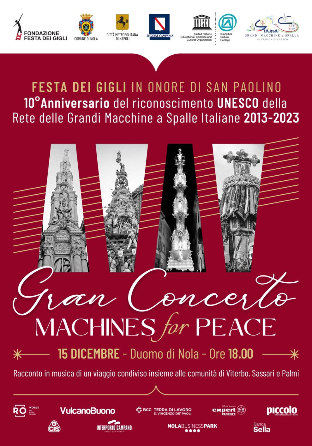 Un messaggio di pace e di fede che la Festa dei Gigli e le sue feste consorelle ci tramandano da secoli e che, il 15 dicembre alle ore 18.00, ribadiremo insieme presso il Duomo di Nola con il Gran Concerto “Machines for peace”.