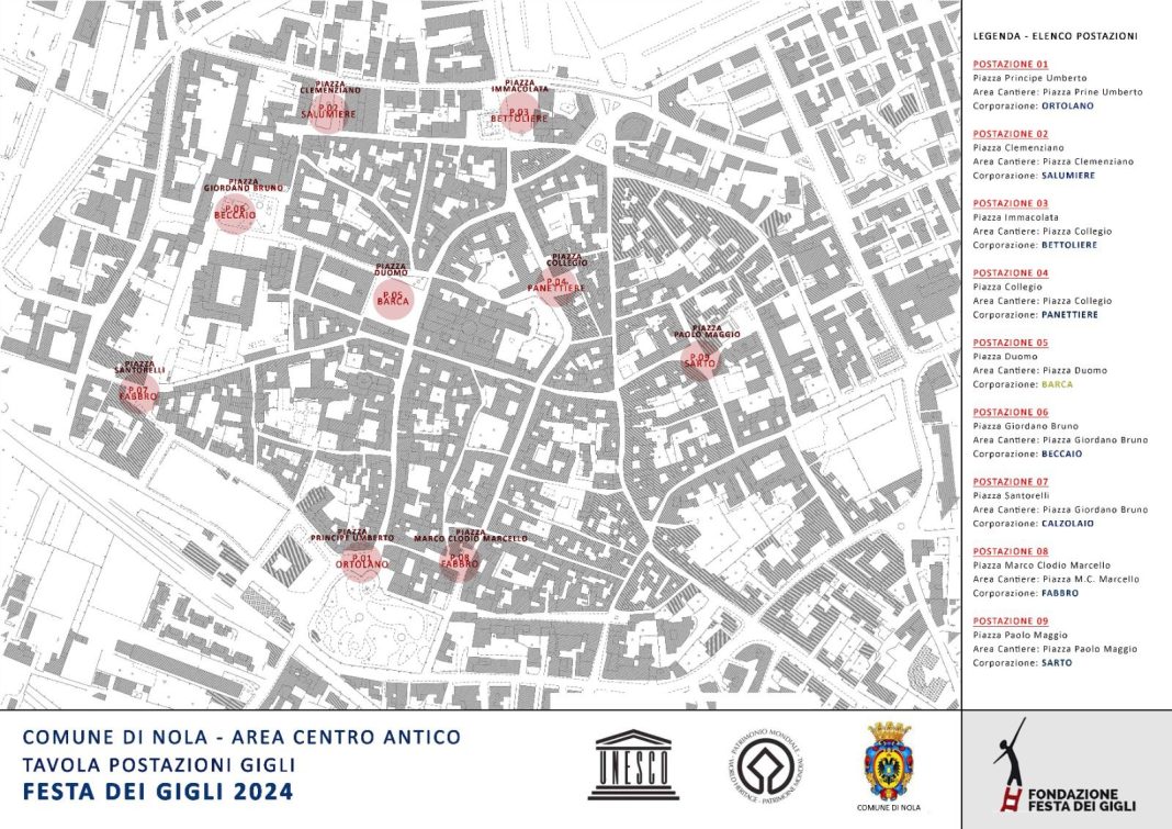 “In maniera condivisa con i maestri di festa abbiamo definito le postazioni dei Gigli e della Barca – afferma il Presidente della Fondazione Festa dei Gigli, Francesco De Falco – ci tengo a sottolineare lo storico traguardo, perseguito e raggiunto attraverso la condivisione e il dialogo, di collocare la Barca in piazza Duomo, scelta che rimarca l’identità storica e la matrice religiosa della nostra Festa.