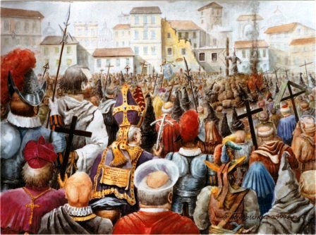 Nella fredda mattinata del 17 febbraio del 1600 il filosofo nolano Giordano Bruno veniva arso vivo a Roma. Spettò alla venerabile Arciconfraternita di San Giovanni Decollato il compito di confortare l’eretico impenitente durante il tragitto dal carcere di Tor Di Nona a Campo dei fiori. La Città di Nola ricorderà il filosofo con la deposizione di una corona di alloro ai piedi della sua statua.