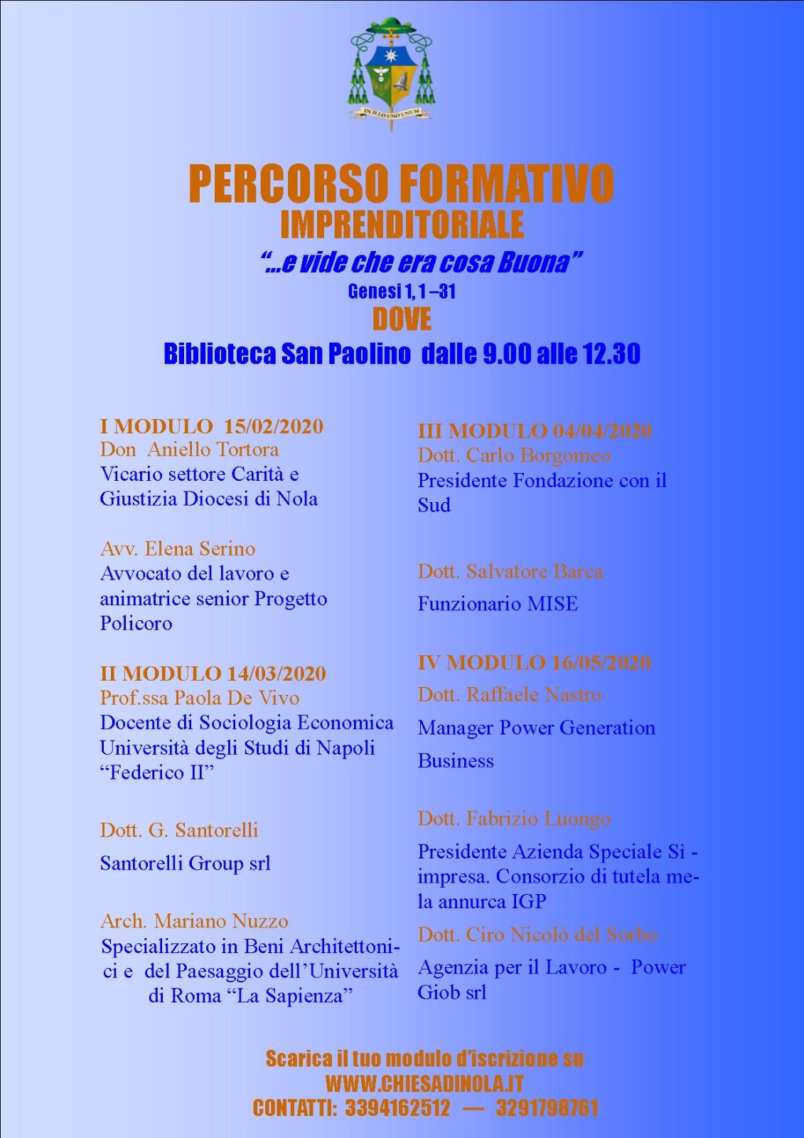 Grande successo per la presentazione della Scuola Imprenditoriale Diocesana presso la biblioteca San Paolino all’interno del Seminario Vescovile di Nola. La Città dei Gigli punta ai giovani, agli affamati di sapere, a chi ha grinta e coraggio per mettersi in gioco senza la paura di affrontare nuove sfide. È per loro che nasce l’ambizioso progetto “Percorso formativo – Formazione imprenditoriale”, organizzato in collaborazione con l’Università Federico II e la Camera di Commercio di Napoli. Il corso è destinato a un’ampia fascia di giovani e adulti con età compresa tra i 21 e i 50 anni. Diviso in quattro moduli con una lezione al mese da febbraio a maggio 2020, il percorso formativo vedrà alternarsi sulla scena grandi personalità, avvocati, manager e docenti universitari, tra cui l’Avv. Serino, Prof.ssa De Vivo, Don Aniello Tortora, Dott. Borgomeo, Dott. Nastro, solo per citarne alcuni.