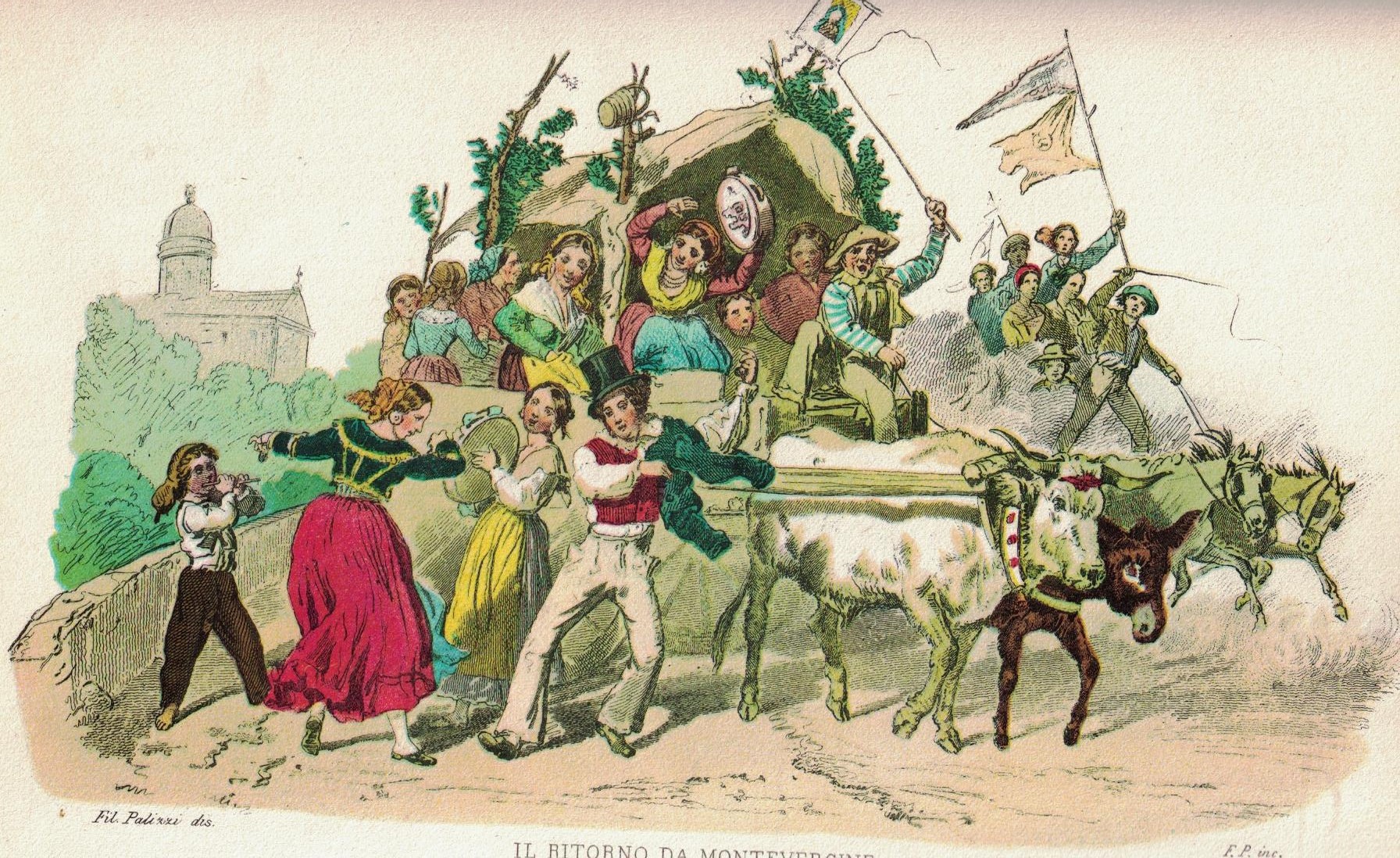 L’8 settembre del 1910 il posto di guardia dei “Seggiari”, sul confine tra Somma e Ottajano, registrò che a mezzogiorno erano passate, dirette verso Ottajano, 96 “carrozze”: e il temine indica in modo inequivocabile vetture “eleganti” tirate da almeno due cavalli, ornati, come imponeva il cerimoniale della festa, di pennacchi e di gualdrappe colorate. Molti carri, trainati da asini e da buoi, entrarono in città dalla via di Sarno e vennero “parcheggiati” lungo la Masseria Greco. Venti giorni dopo il comandante delle guardie urbane ottajanesi spiegava al sindaco che non era stato possibile evitare risse anche gravi, e bloccare “mariuoli e altra pericolosa gente” perché la folla dei pellegrini era stata “innumerabile”. Il che dimostrava che già vigorosa era la resurrezione della città, distrutta quattro anni prima dal Vesuvio. I cronisti descrissero brevemente la giornata con i soliti colori che tingevano la realtà con le tinte dei “luoghi comuni”: i cantanti “’a fronna ‘e limone”, i banchi di “semmentari” e di “franfelliccari” che vendevano semi di zucca e “bastoncini di zucchero caramellato”, gli enormi “tiani” con le ultime “pullanchelle” – le spighe di granoturco lessate o abbrustolite -, e poi tutti gli strumenti musicali del folklore di Napoli e della sua Piedigrotta.