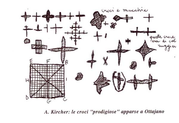 Per fortuna il gesuita Athanasius Kircher, non accontentandosi di questa troppo facile spiegazione, inviò a Ottajano Giovanni Rho, Provinciale dei Gesuiti napoletani e fervente devoto della Croce. Il Rho interrogò, indagò e apprese che le croci avevano un colore di piombo e di ruggine, che resistevano all’acqua, ma non al sapone, che dopo una decina di giorni scomparivano da sole, e, soprattutto, che si erano formate solo su superfici umide – anche sulle carni e sulle pesche – e su tessuti di lino e di seta. Fu facile per Kircher concludere che le particelle minerali diffuse nell’aria dalla eruzione e il vapore avevano distillato una densa rugiada e che questa si era condensata in forma di croce nelle trame dei tessuti. Nessun miracolo, dunque, ma una causa naturale.