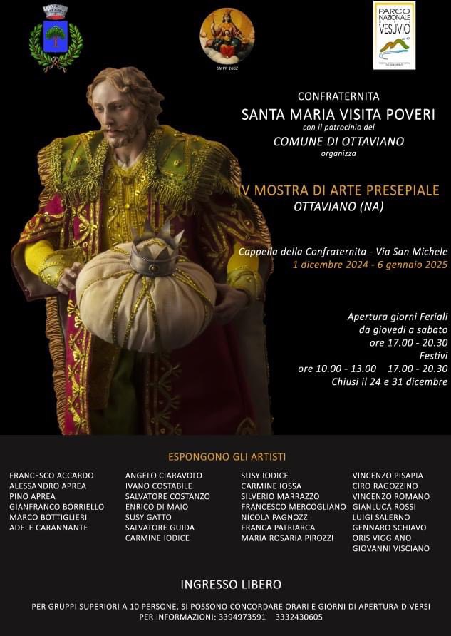 Anche quest’anno il dott. Francesco Annunziata e i Confratelli organizzano nella Cappella della Confraternita di Santa Maria Visitapoveri, in via San Michele, la mostra dell’arte presepiale, la quarta della serie. Hanno inviato le loro opere artisti importanti, capaci di “leggere” e di riprodurre con una tecnica degna di ammirazione aspetti importanti del Presepe e della Natività di Gesù. La Cappella è nel cuore del Centro Antico di Ottaviano, della “Terra Vecchia”, dove ogni pietra e ogni immagine sono vive testimonianze di antiche tradizioni che univano potenti e umili in una sola, salda comunità. La Mostra si apre il 1° dicembre e sarà aperta al pubblico fino al 6 gennaio 2025, negli orari indicati dalla locandina.