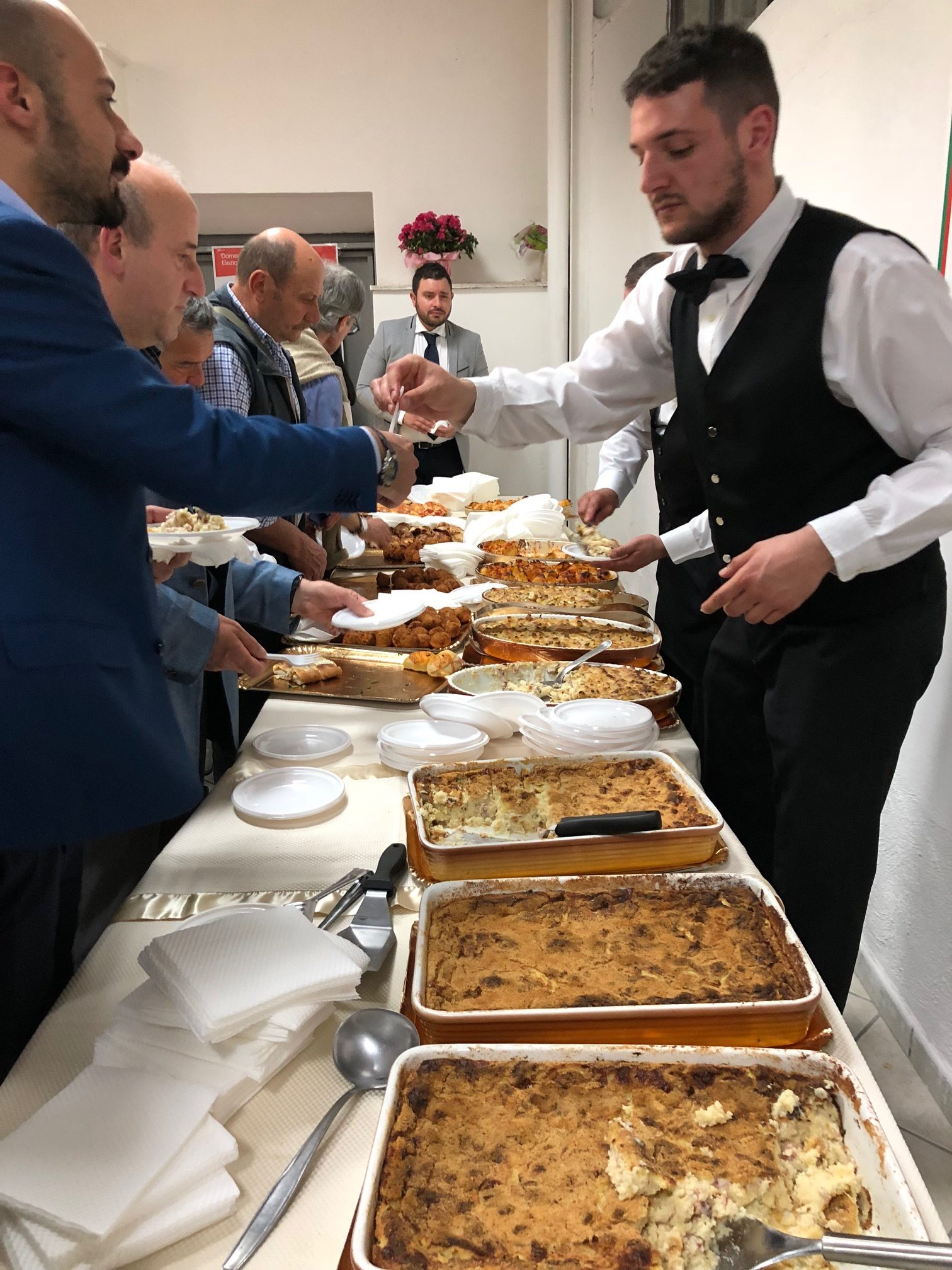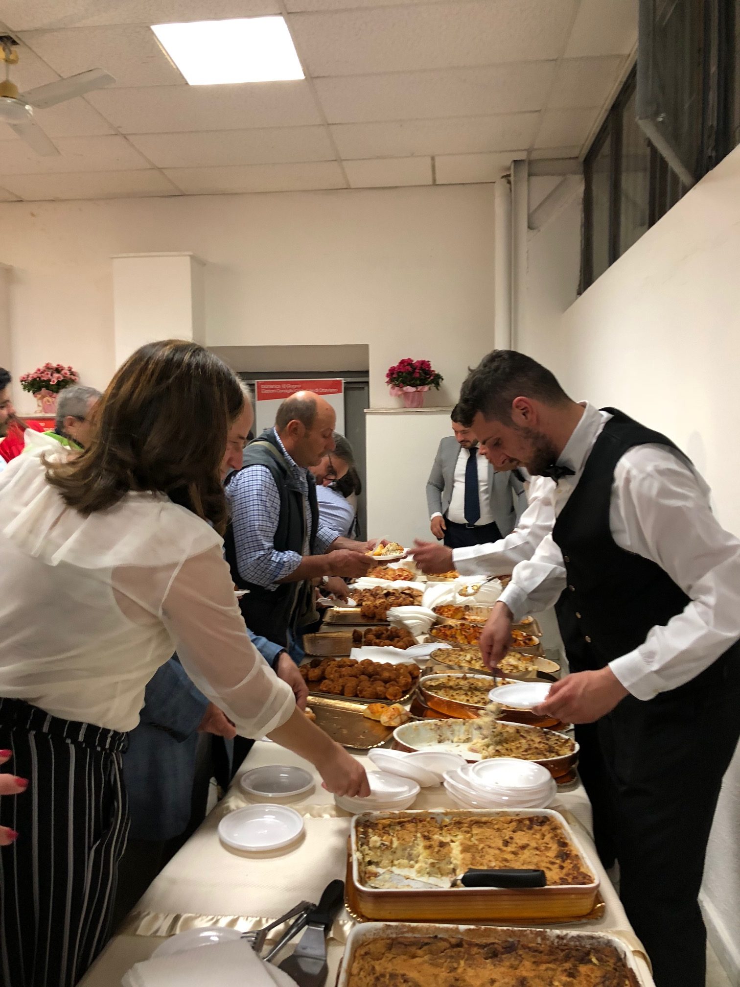 L’intervento del candidato sindaco, sorriso smagliante, è stato breve, brevissimo. Poco meno di quattro minuti. Ha ringraziato i presenti, tanti in verità (la manifestazione era prevista per le 19, è iniziata più di un’ora dopo, solo quando la sala del comitato di viale Elena si è riempita quanto bastava per «accontentare» Nocerino che aveva annunciato di attendersi almeno 300 persone – “Se sono di meno non va bene” – aveva detto poco prima) e li ha ringraziati per aver dedicato, all’apertura della sua seconda campagna elettorale da sindaco in cinque anni, del tempo. Già, il tempo. Da qui è partito Nocerino: «Il tempo è la cosa più preziosa che si possa regalare, ed è questo che faremo: dedicheremo ad Ottaviano del tempo, risolveremo i problemi. La promessa che ho fatto è quella di riportare Ottaviano allo splendore di un tempo, farla tornare culla della cultura. Ottaviano un tempo era il fiore all’occhiello delle industrie, si produceva di tutto, dalle bottiglie alla tela. Soprattutto, era piena di gente che non aveva difficoltà. Oggi si sono persi i vecchi valori, noi dobbiamo fare in modo che siano recuperati e trasmessi ai nostri figli. Però, per fare questo, dobbiamo ricostruire quello che adesso non c’è: io ricordo quando ero più giovane, percorrevamo viale Elena fino al Castello, impiegavamo 45 minuti. Ora ci vogliono pochi secondi, non c’è nessuno. Ecco, dobbiamo fare in modo che Ottaviano ridiventi attraente sotto tutti i punti di vista, dateci una mano, dateci fiducia. E ricordate che questo non è il fondo del barile, ma l’inizio della rinascita perché, credetemi, con voi cambiare si può». Non ha illustrato il programma, nemmeno vi ha fatto cenno (ma c’è, ed è corposo – leggi qui ). Non ha detto una parola sul presente, ha lasciato le poche stilettate all’indirizzo degli avversari ai suoi compagni di tavolo, ha solo detto, ricapitoliamo, che in passato si stava meglio e che quei tempi possono tornare. Applausi? Tanti. E in tanti sono rimasti a condividere il buffet preparato nel comitato. Per oltre duecento persone: rustici in abbondanza, primi piatti, bevande e sfogliatelle a go go. Il leitmotiv (e l’hashtag della campagna elettorale): #cambiaresipuò.