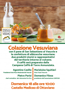 “Siamo partiti dalla colazione perché rappresenta, il risveglio, la ripartenza- afferma Agostino Casillo Presidente dell’Ente Parco- quello di cui c’è bisogno per liberare le forze sane del territorio e promuovere i magnifici prodotti che esso ci dona. Il pane e l’albicocca sono i due prodotti su cui puntare per replicare la storia di successo del pomodorino del piennolo. Iniziamo domenica, sperando anche nella partecipazione dei più piccoli, a promuovere una colazione sana, gustosa e vesuviana”.