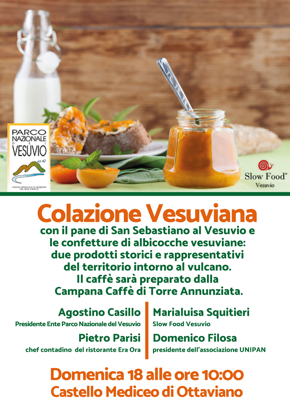 Domenica 18 dicembre alle ore 10:00 presso il Castello Mediceo di Ottaviano facciamo colazione insieme in stile vesuviano, con il pane di San Sebastiano al Vesuvio e le confetture di albicocche vesuviane, due prodotti storici e molto rappresentativi del territorio intorno al Vulcano, entrambi in procinto di diventare “presìdio Slow Food”. Una prima colazione unica, in cui il sapore semplice del pane incontra la confettura e diventa molto di più, sia in termini di gusto che di alimentazione sana e di cultura del territorio. La colazione sarà preparata dal “cuoco contadino” Pietro Parisi, i prodotti in degustazione saranno presentati da Marialuisa Squitieri in rappresentanza della condotta Slow Food Vesuvio, il pane di San Sebastiano sarà quello di Domenico Filosa, pane “a otto”, quello che dura otto giorni in dispensa, mentre il caffè sarà preparato dalla Torrefazione Campana di Torre Annunziata.