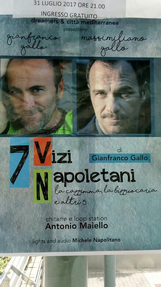 I fratelli Gallo in questo spettacolo di teatro canzone raccontano in modo viscerale e coinvolgente i difetti di quel particolarissimo e stupendo angolo di mondo di cui loro stessi fanno orgogliosamente parte. I sette vizi descritti da Gianfranco, sulla falsa riga di quelli capitali, hanno nomi particolari e in gran parte coniati dallo stesso autore: oltre all’immancabile cazzimma, che in alcuni casi è più una virtù che un vizio, ci sono la Bizzuocaria, la Vittimismeria, la Sfrantummazione, la Maschimeschinità, la Scassoneria e la Gomorra.