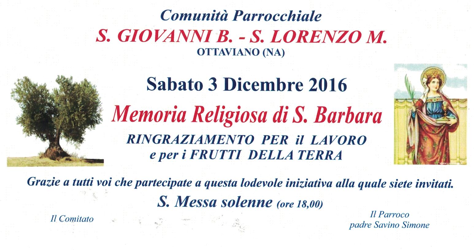 Un’esortazione alla speranza è l’omaggio che sabato 3 dicembre i contadini ottavianesi tributeranno, nella Chiesa di San Giovanni, a Santa Barbara. La tradizione di questo culto, di antica data, venne ripresa e rinnovata, qualche anno fa, dal parroco don Antonio Fasulo: il parroco di oggi, don Savino, la comunità parrocchiale di San Giovanni e di San Lorenzo, e Vincenzo Caldarelli, che cura l’organizzazione della cerimonia “laica”, mirano a interpretare il rito in una prospettiva non solo storica e religiosa, ma anche sociale, nella speranza che l’agricoltura, affidata al lavoro dei giovani, possa salvare l’economia della città. Il prof. Cimmino ha trovato interessanti documenti, che pubblicherà prossimamente, su un rito di offerta dei frutti della terra che si tenne nel dicembre del 1632 nella chiesa di San Michele, in due cappelle, una consacrata a San Felice e l’altra alla Madonna del Carmelo. Questa cappella, sotto il patronato della famiglia Nardi, era retta in quella data dal sacerdote G.B. Bifulco. Dice il prof. Cimmino che non a caso le famiglie Nardi e Bifulco controllavano il fiorente mercato delle castagne e delle mele annurche prodotte a Ottajano.