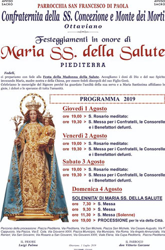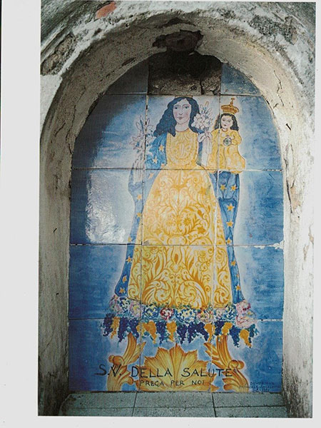 Quest’anno la festa in onore della Madonna della Salute è stata celebrata solo con i riti religiosi (vedi foto in appendice) e con la processione; la parte “laica”- musica, piatti, fuochi- non si è svolta: si spera che sia solo l’interruzione momentanea di una lunga e importante tradizione. Il centro del culto è Piediterra: il nome nacque dal fatto che il quartiere e la piazza stavano “ai piedi” della “Terra vecchia”, della parte antica di Ottajano ed erano attraversati dalla strada che i signori della città e i “galantuomini” dovevano percorrere per raggiungere le masserie, i vigneti e le cave di pietra di Terzigno. Lungo questa strada le famiglie importanti della città, quelle legate ai Medici – i Bifulco, i Mazza, i Guastaferro – costruirono le loro “case palaziate” e i bassi e le cisterne per gli “operai e i faticatori”.Nel1615 il vescovo di Nola, Lancellotti, durante la sua visita pastorale, venne accompagnato da G.B. Mazza, primicerio della Chiesa di San Michele, e da Giovanni D’Ambrosio, rettore della Chiesa dell’Annunziata, a benedire la chiesetta di “Santa Maria della Salute”, nel quartiere “che si chiama “ai piedi della Terra””, e le vicine cisterne dell’acqua. Queste cisterne spiegano tutto. Esse costituirono, almeno fino alla prima guerra mondiale, la “fontana” pubblica da cui attingevano acqua gli “umili” dei quartieri vicini: solo i ricchi poteva permettersi di costruire pozzi nei cortili delle case.. La “cisterna”- ancora oggi la zona è attraversata da via “Fontana”- era alimentata da una ricca sorgente sotterranea, che rendeva fertile la campagna all’intorno, tanto che la masseria che i Medici possedevano in quel territorio prese il nome di “Paradiso”, e ancora oggi il luogo si chiama così. Quando imperversava la siccità, la “fontana” veniva alimentata con l’acqua che carri attrezzati per il difficile compito andavano a prendere nei canali del fiume Sarno.