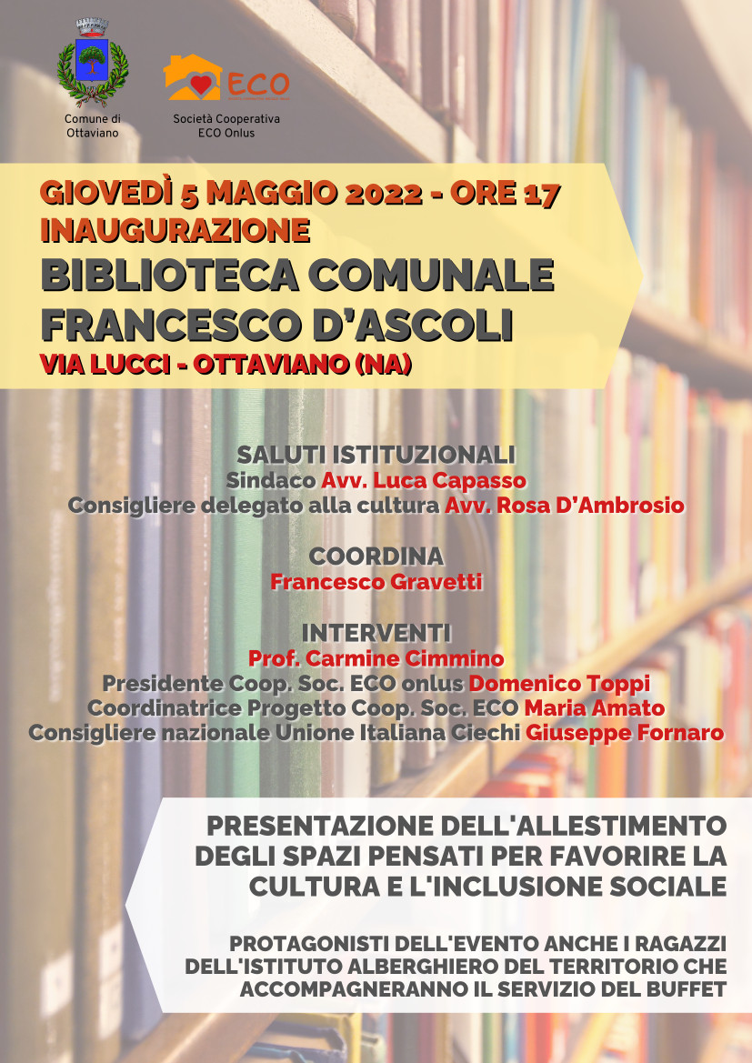 Si terrà giovedì 5 maggio, alle ore 17, l’inaugurazione della biblioteca comunale di Ottaviano, con sede in via Lucci, intitolata a Francesco D’Ascoli.