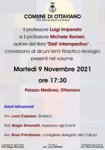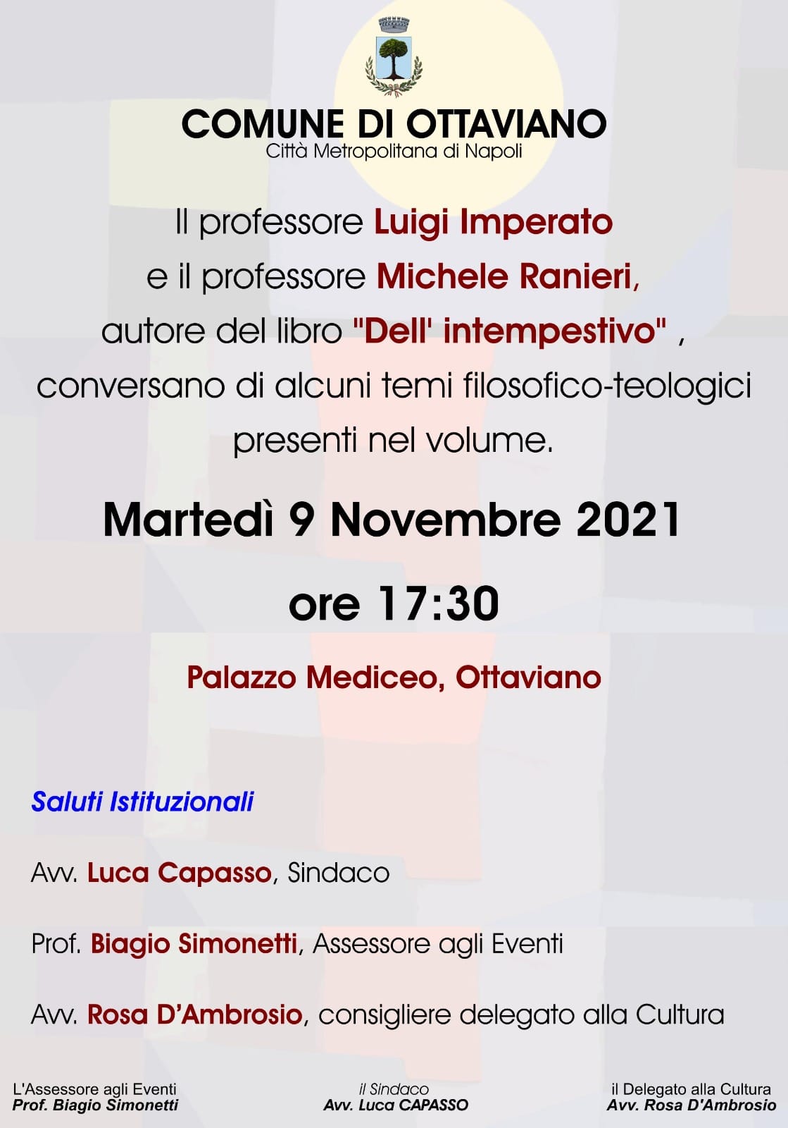 Martedì 9 novembre, a partire dalle ore 17.30, a Ottaviano, nel Palazzo Medici il prof. Michele Ranieri presenta il suo libro “Dell’intempestivo” conversando sui temi filosofici e teologici trattati nel volume con il prof. Luigi Imperato, che è profondo studioso della filosofia tedesca e insegna filosofia e storia al Liceo Classico di Portici.