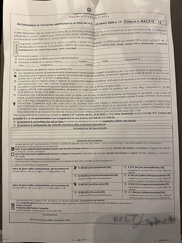 “Mi ha sempre contraddistinto la trasparenza, ecco la multa che mi è stata notificata stasera. Nel notificarmela, i carabinieri certificano che ho detto la verità: non ero a Saviano, non ero alla commemorazione della salma all’ospedale (avvenuta alle 11) ma al minuto di raccoglimento avvenuto alle 10 nei pressi del parcheggio dell’ospedale. RIPETO: al minuto di raccoglimento delle 10. Pago la multa, pago una leggerezza commessa, mi sono messo in quarantena. La legge è uguale per tutti. Ma non ho detto bugie”