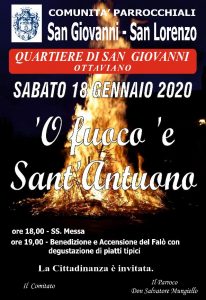 Sabato, 18 gennaio, il rito del “fucarone” in piazza San Giovanni.La complessa storia del culto dell’eremita egiziano Antonio. Il Santo guaritore e il terribile “fuoco sacro”. Significato dell’immagine del maialino presente nell’iconografia di Sant’Antonio, e la protezione degli animali. La tradizione ottavianese del culto.