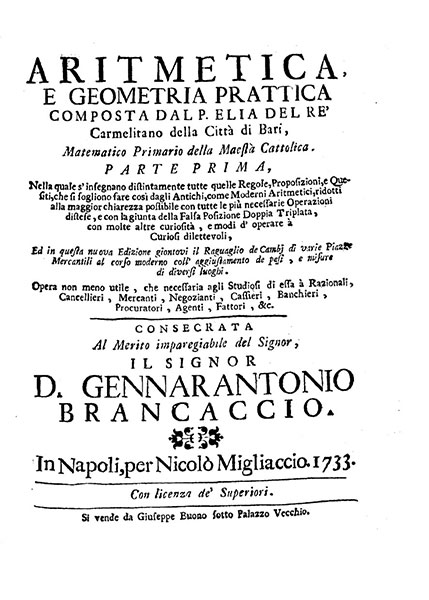 Elia del Re, nato a Bari nel 1654, divenne carmelitano a 16 anni. Fu matematico, astronomo e astrologo: era tale il suo interesse per l’astrologia che si presentava come “Astrologo Reale di Bari” e si firmava “Parmeno, l’aratore dei cieli”. Notevole è la sua opera “Aritmetica e Geometria prattica”, pubblicata in varie edizioni, e dedicata dal tipografo di ogni edizione a un “patrono” specifico: per esempio, la prima edizione, quella del 1697, lo stampatore Carlo Troisi la dedicò al duca Marcello Mastrilli, mentre quella del 1733 (vedi immagine in appendice) Nicola Migliaccio, tipografo in Napoli, la “consacrò” al “merito impareggiabile” di Gennarantonio Brancaccio. L’opera era un’enciclopedia di nozioni non solo di matematica e di geometria, ma anche di contabilità amministrativa messa a disposizione di “banchieri, razionali, agenti, fattori, mercanti”. All’ astrologia Elia del Re dedicò nell’anno 1700 il “Discorso Astrologico”, in cui annunciò la morte “ di un grande Principe come quella di un grande Vecchione”: e poiché in quell’anno morirono, a poca distanza l’uno dall’altro, Carlo II re di Spagna e papa Innocenzo XII, era fatale che il profeta venisse arrestato con l’accusa di aver coltivato l’astrologia, disciplina superstiziosa. Ma egli seppe dimostrare che la sua scienza astrologica era fondata su principi matematici, e riuscì ad evitare la condanna, anche perché ai giudici non piacque l’idea di aver un siffatto nemico. E infatti egli continuò a pubblicare profezie astrologiche: per il marzo del 1702 vaticinò che un terribile terremoto avrebbe devastato Napoli e che ci sarebbe stata una strage di soldati napoletani arruolati nei reggimenti di Spagna. Per alcuni giorni Napoli si fermò, le botteghe restarono chiuse, non si tennero mercati, tutti aspettavano da un momento all’altro la catastrofe. Ma per fortuna non accadde nulla: e noi possiamo agevolmente immaginare quali pensieri e quali parole i Napoletani dedicassero al profeta. L’arcivescovo di Napoli Giacomo Cantelmo lo fece rinchiudere in una segreta del Carmine Maggiore con l’accusa di aver provocato turbamento e disordini nella città di Napoli e in tutto il territorio: ma l’astuto carmelitano gli fece notare che le sue profezie erano state pubblicate a stampa con “licenza dei superiori” e con dedica a Filippo V di Spagna.
