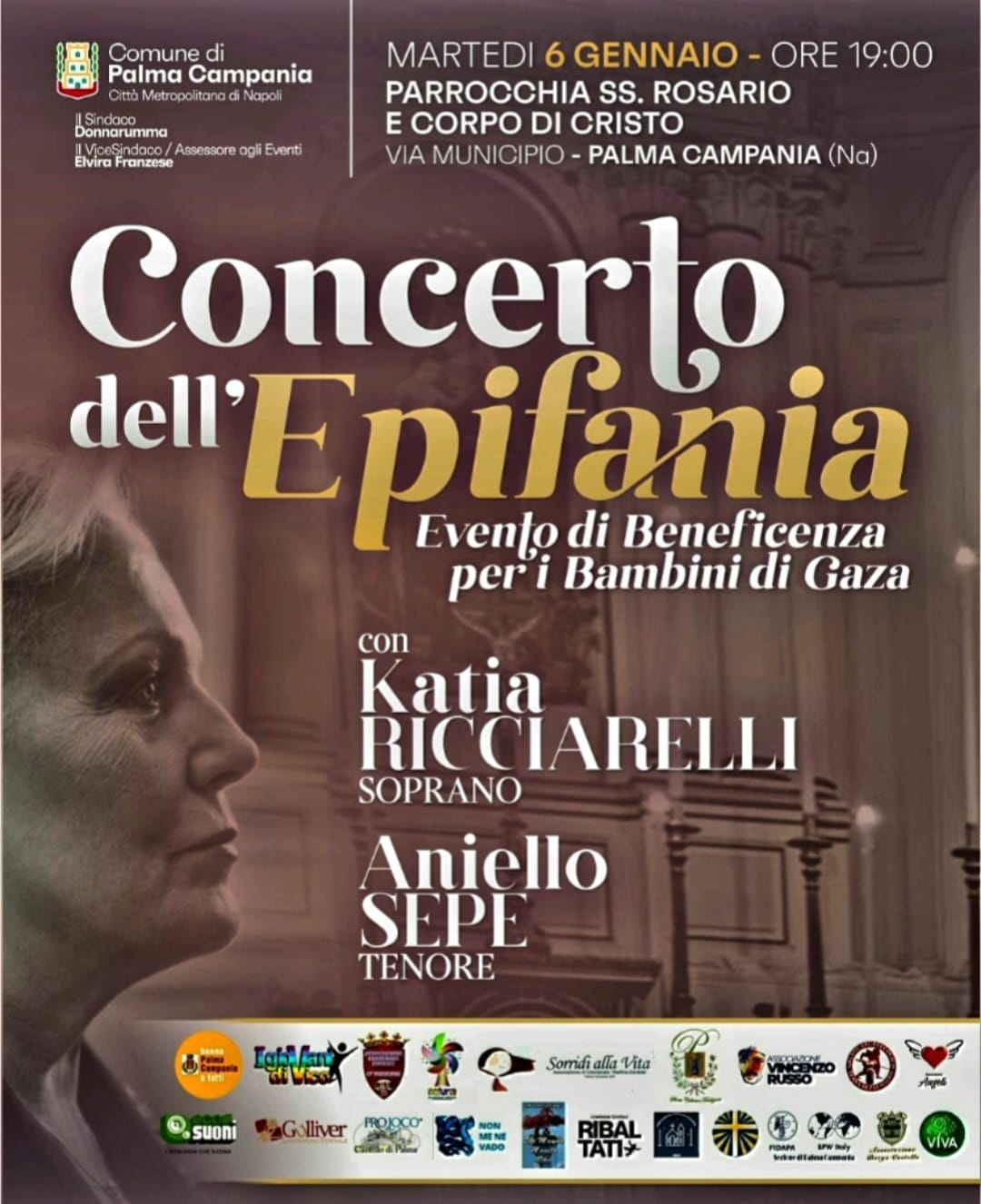 Palma Campania. Martedì 6 gennaio, alle ore 19:00, presso la parrocchia SS. Rosario e Corpo di Cristo, si terrà il Concerto dell’Epifania del Maestro Aniello Sepe. Ospite della serata Katia Ricciarelli.