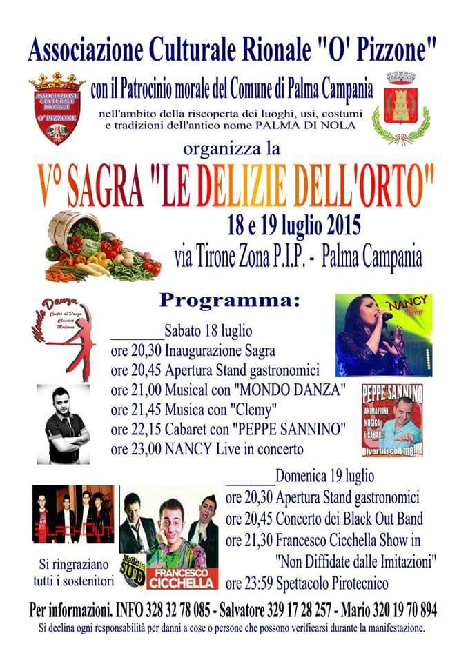 La sagra sarà organizzata dall’associazione culturale rionale “O’ Pizzone” (presidente Mario Nunziata, segretario Salvatore Cosenza) con il patrocinio morale del Comune di Palma Campania. L’evento avrà luogo presso la zona Pip di via Tirone e prevede due giorni di musica, cabaret, balli e degustazioni, con numerosi stand gastronomici. Si comincia sabato 19 alle 20,30 con l’apertura degli stand e l’esibizione di “Mondo Danza”. Seguirà la musica di Clemy e il cabaret di Peppe Sannino. Chiuderà la serata il concerto di Nancy.